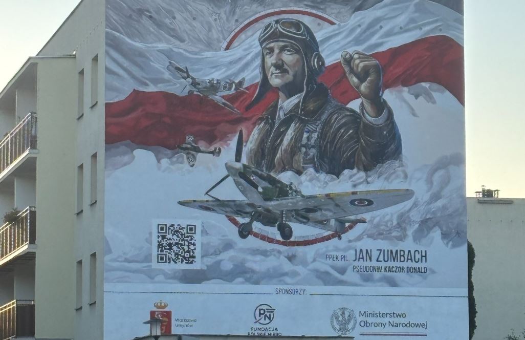 Malowidło poświęcone słynnemu pilotowi Dywizjonu 303 odsłonięto przy ul. Kazury 2E na Ursynowie – w miejscu szczególnym, bo to właśnie tam, w dawnej wsi podwarszawskiej, Jan Zumbach przyszedł na świat.