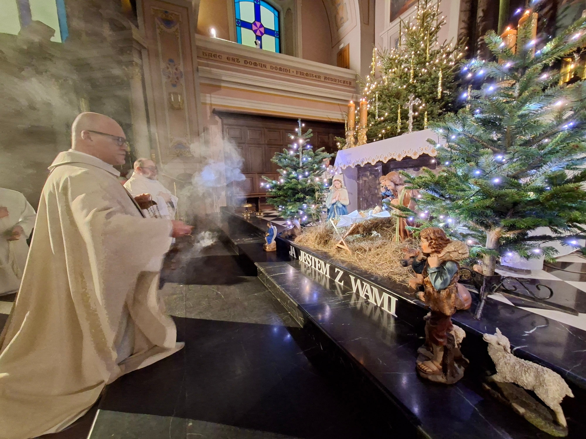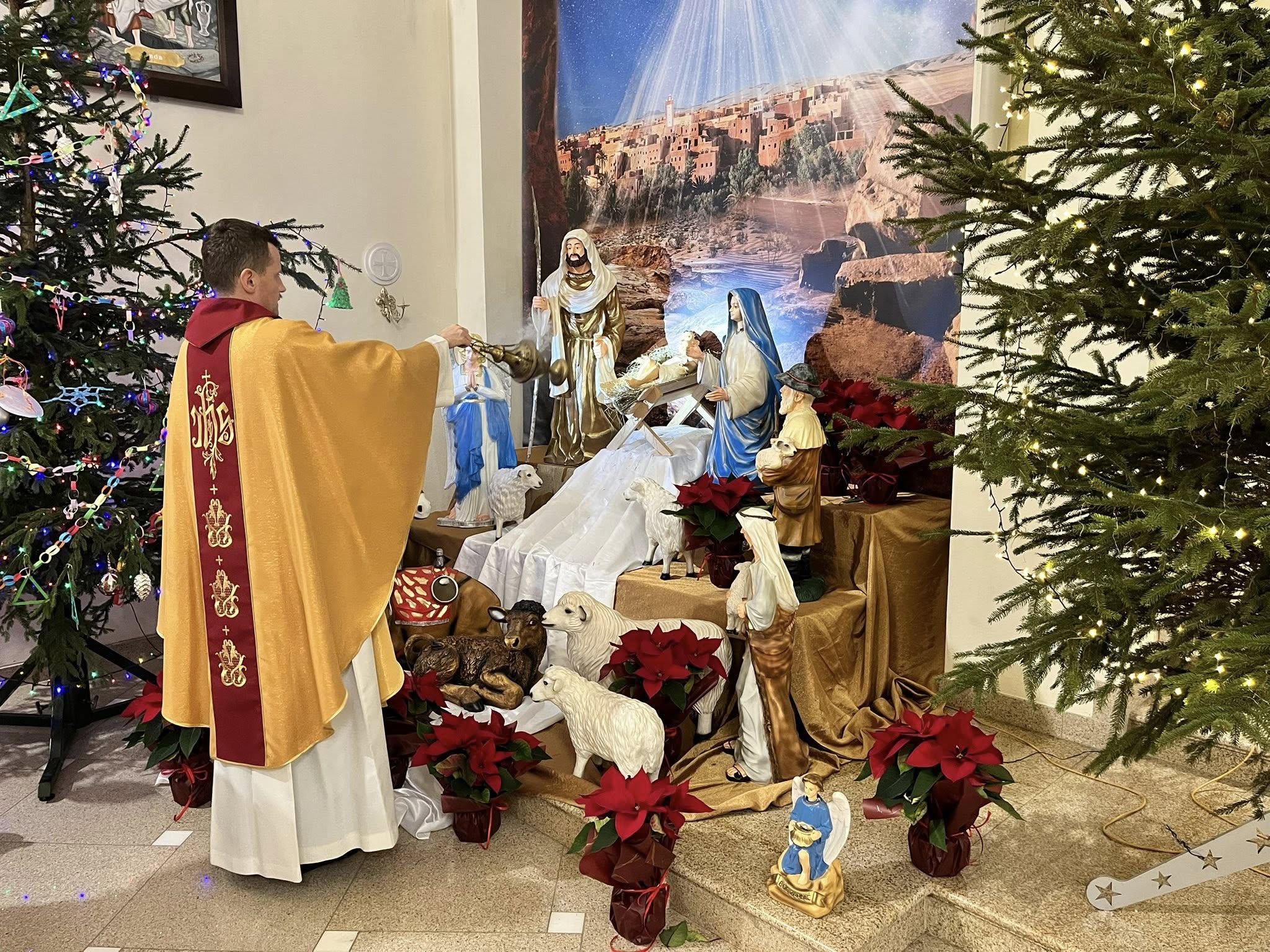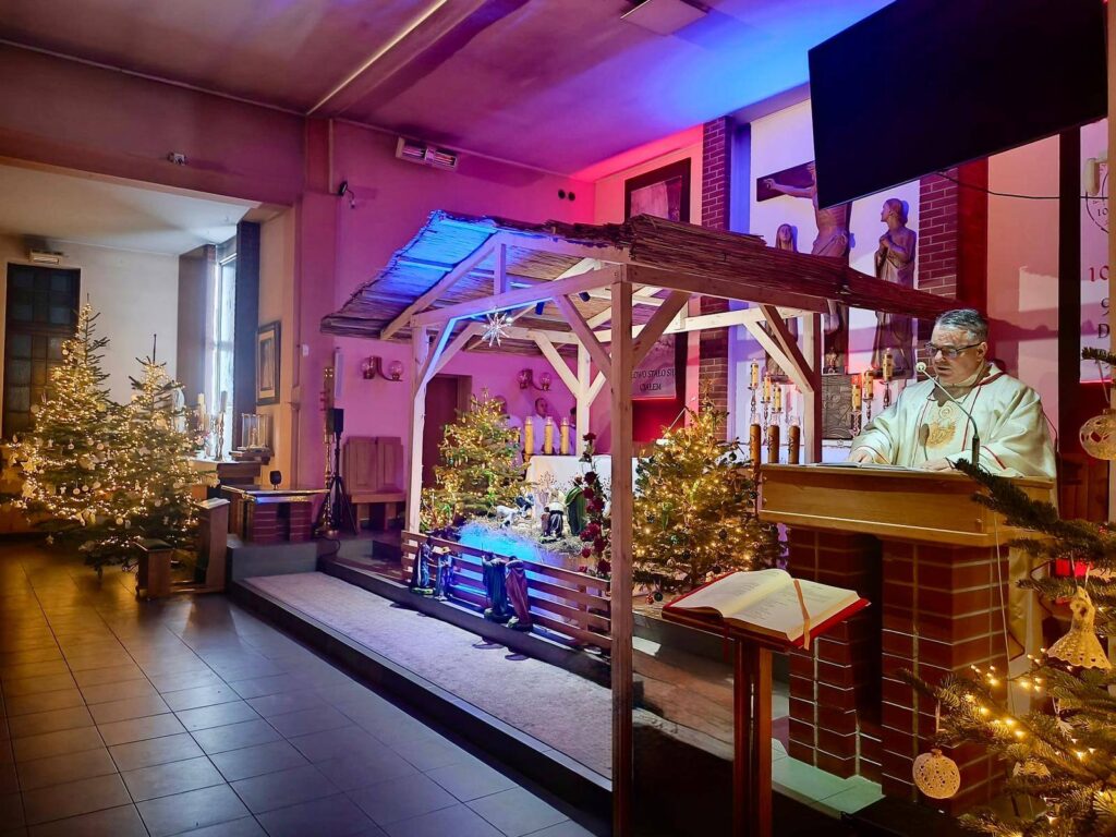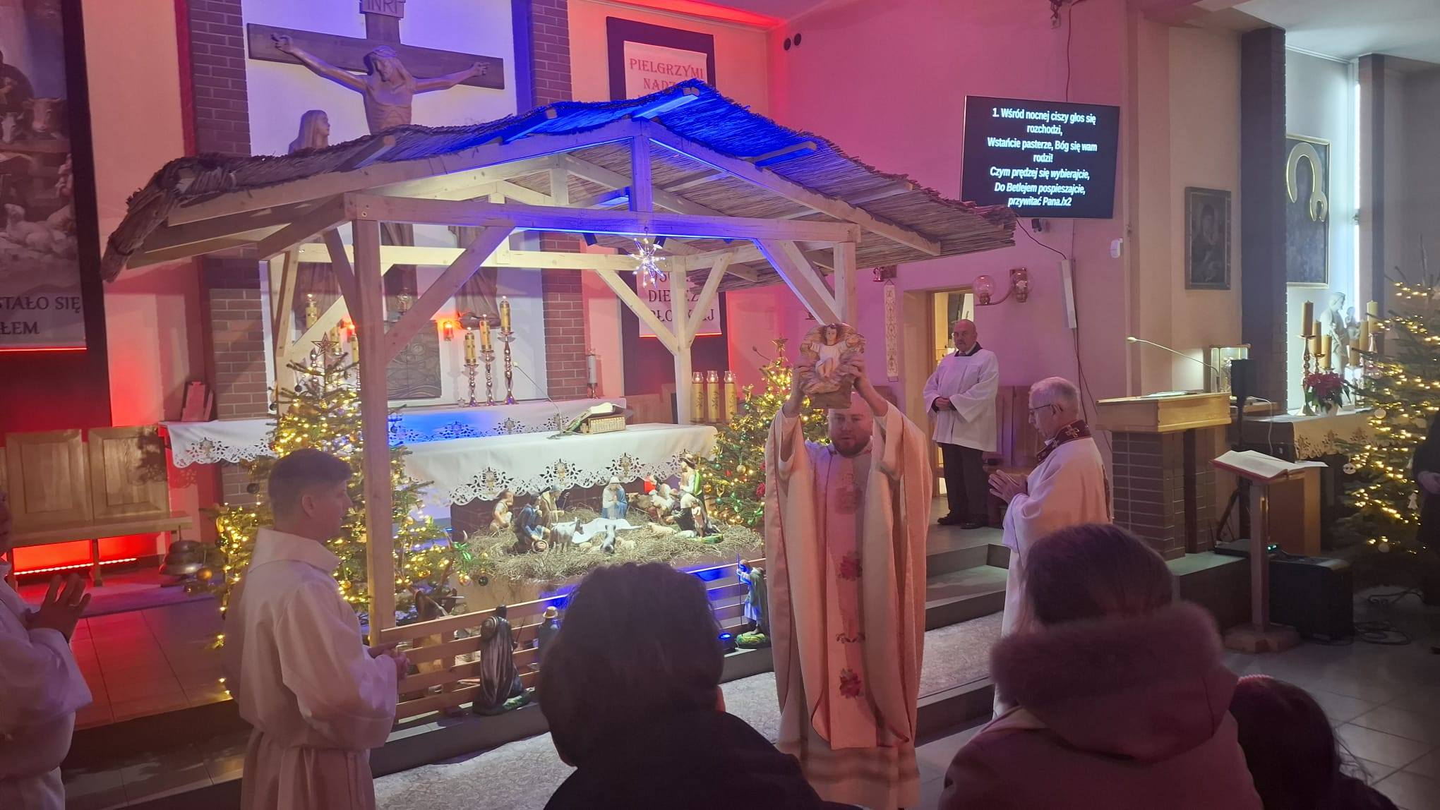 … i pod wezwaniem św. Faustyny Apostołki Bożego Miłosierdzia w Rogozinie, gdzie proboszcz ks. Janusz Wiśniewski na zakończenie pasterki miał dla swoich parafian niespodziankę, a tak naprawdę wcale nie niespodziankę, bo prezenty rozdaje tego dnia już od blisko dwóch dekad. Ten zwyczaj podpatrzył podczas swojego pobytu w Niemczech i z powodzeniem powtarza u nas. Rozdawał już np. bombki, a tym razem – dla każdego domu – podkowy. A tak wygląda żłóbek w Rogozinie…