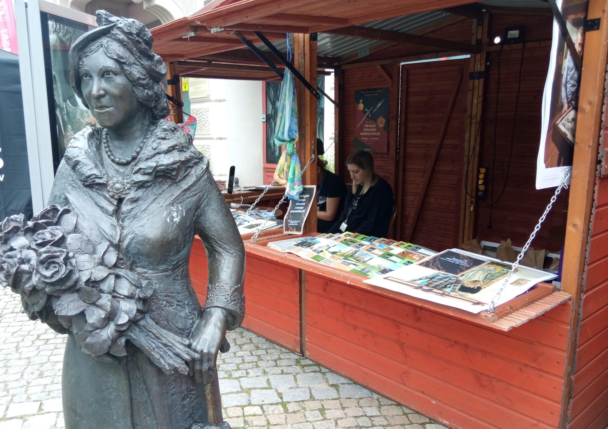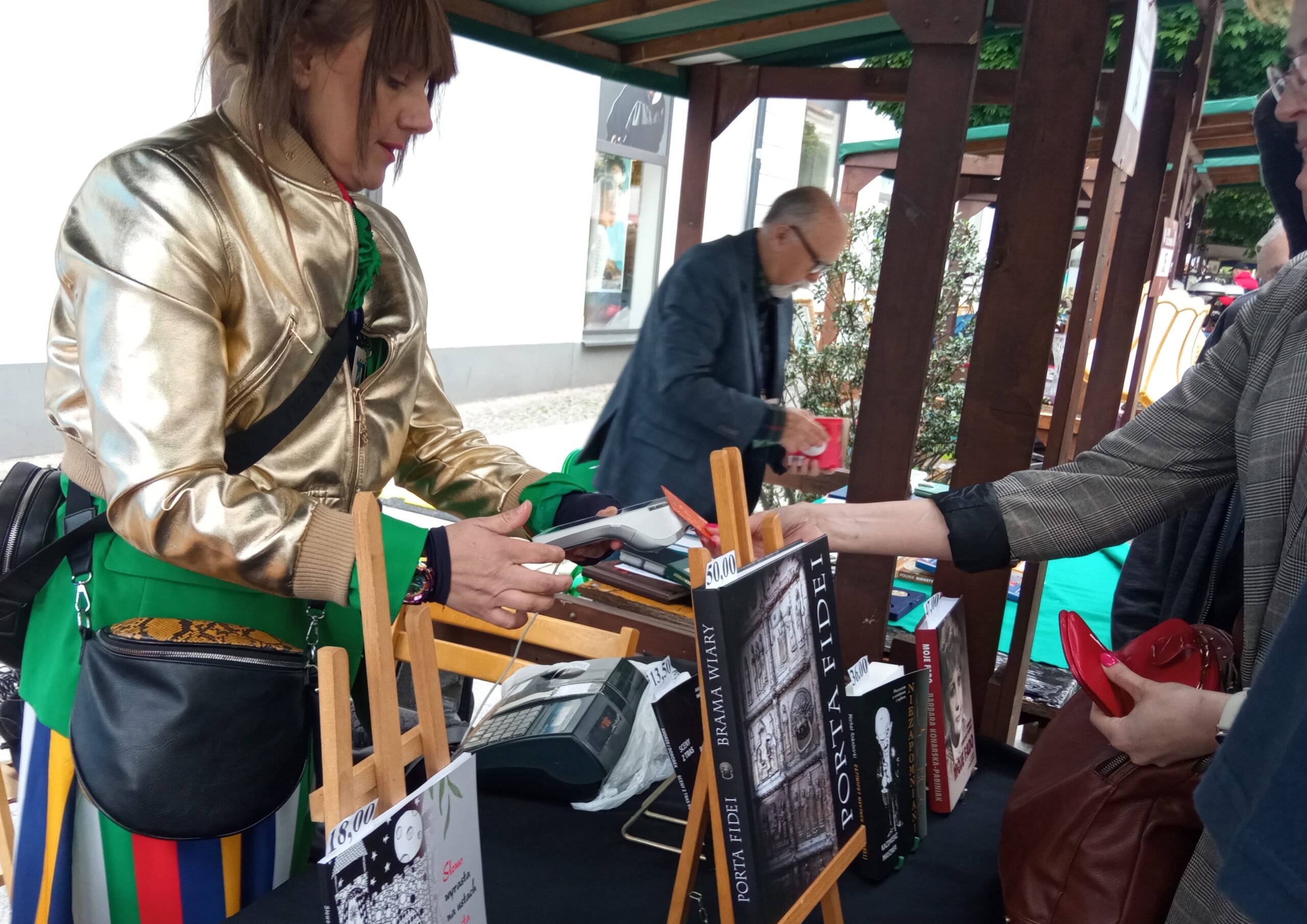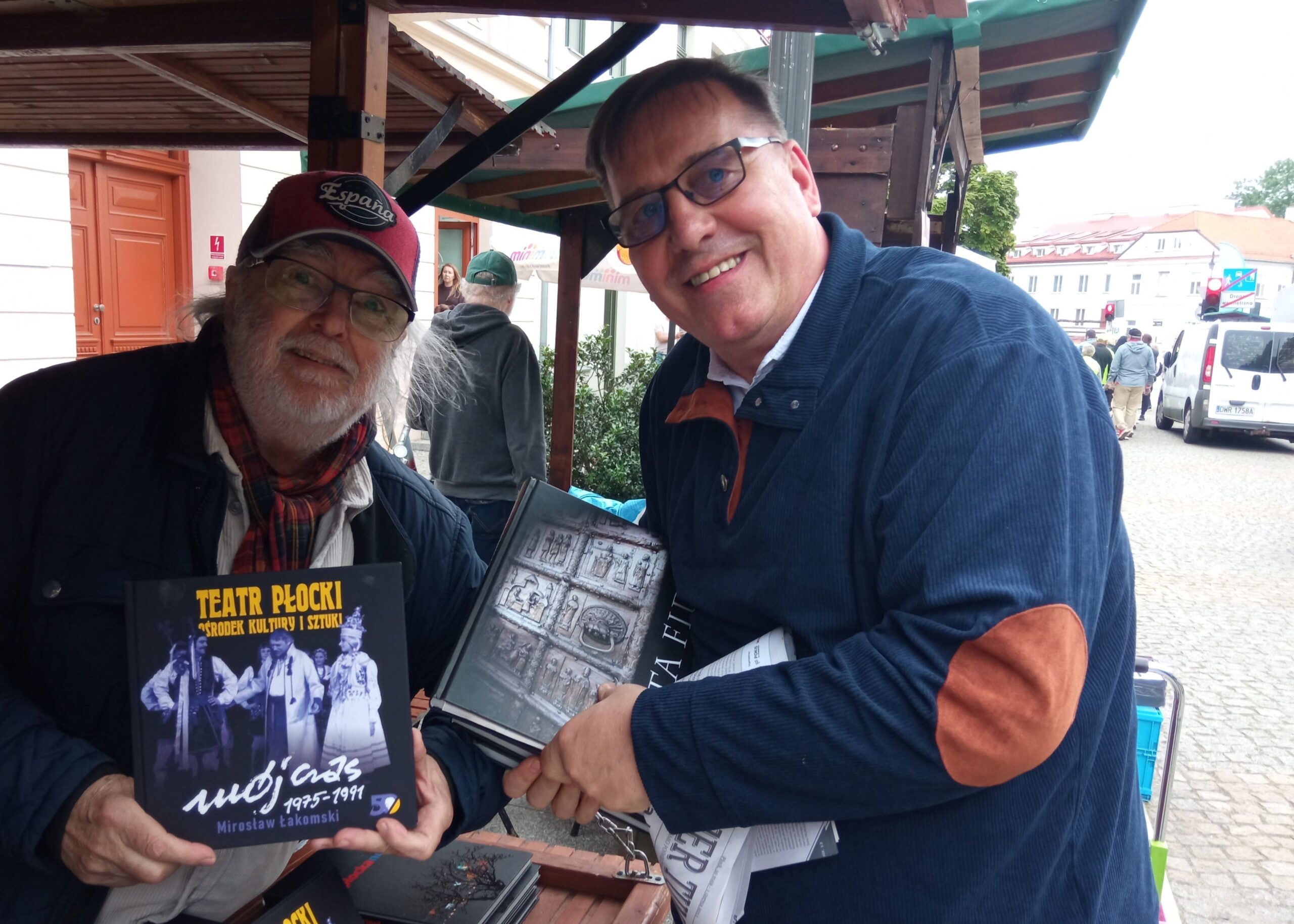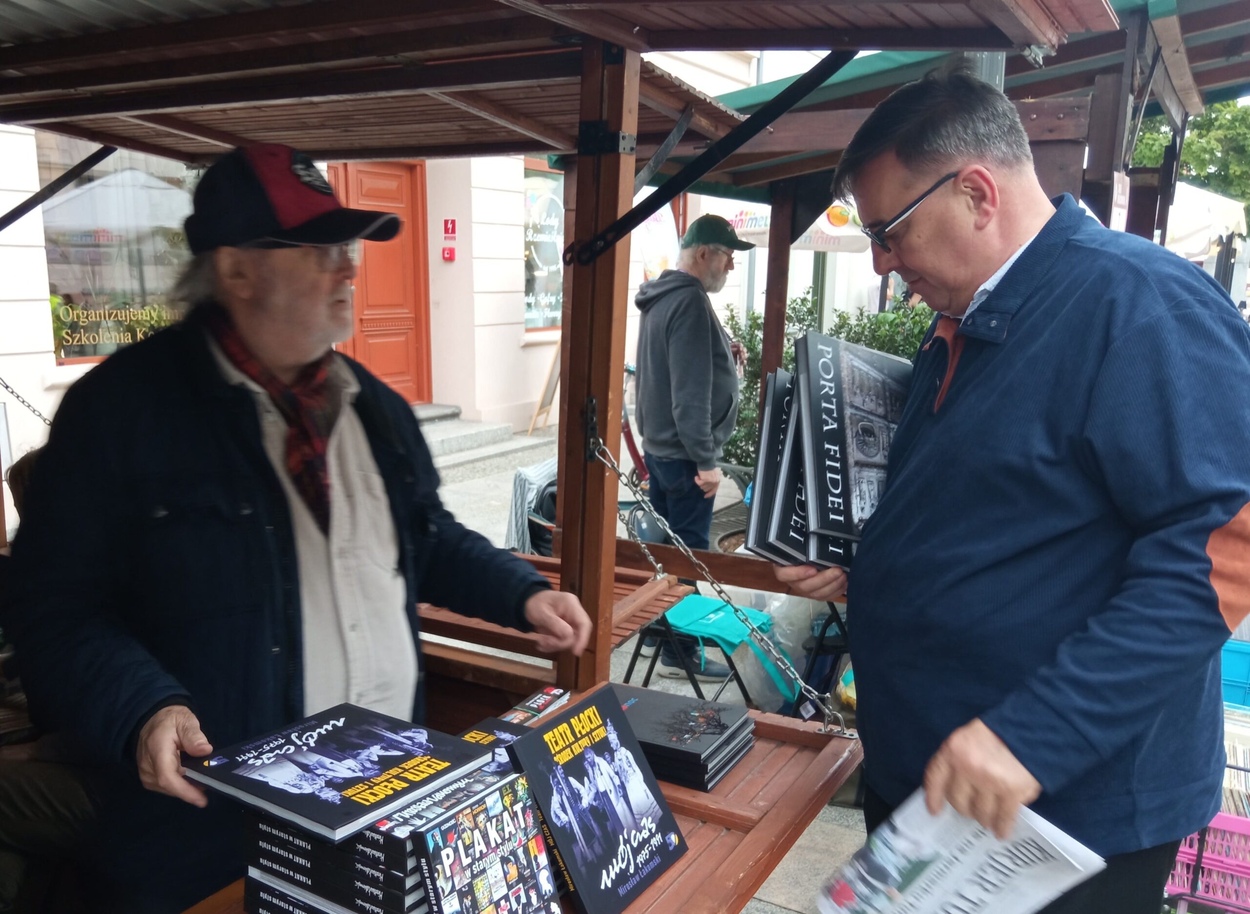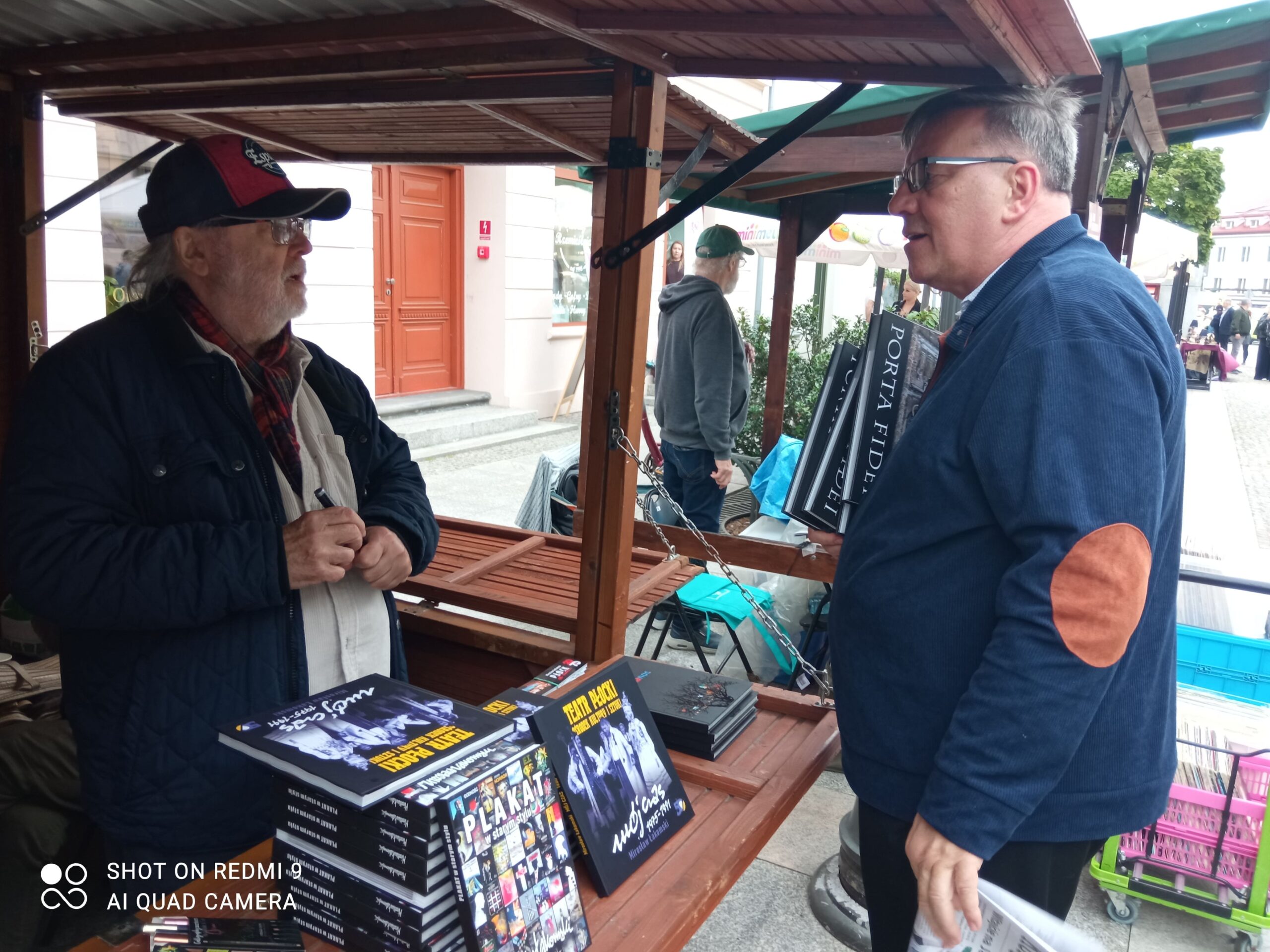 Na zdj. u góry: stoisko Mirosława Łakomskiego z książkami o Płocku. Z autorem – proboszcz parafii katedralnej ks. Stefan Cegłowski.