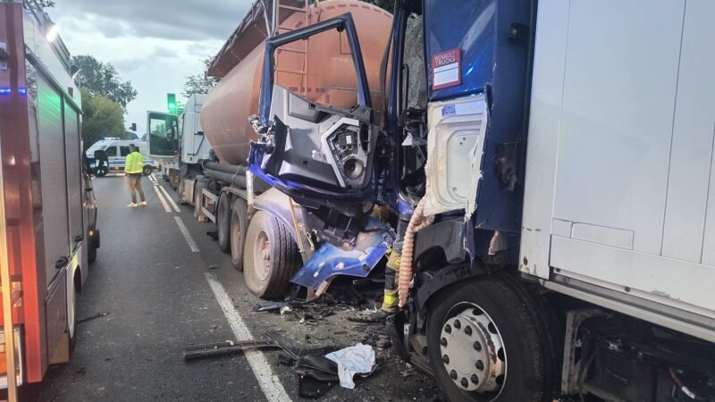 Wypadek w Imielnicy. Trzy ciężarówki zderzyły się na skrzyżowaniu przy kościele. Droga jest zablokowana