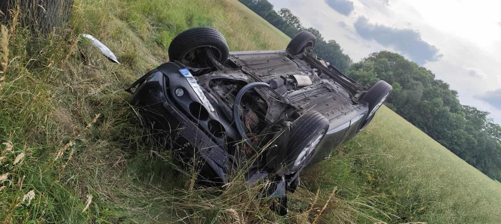 Nissan dachował, renault z naczepą uderzyło w ogrodzenie