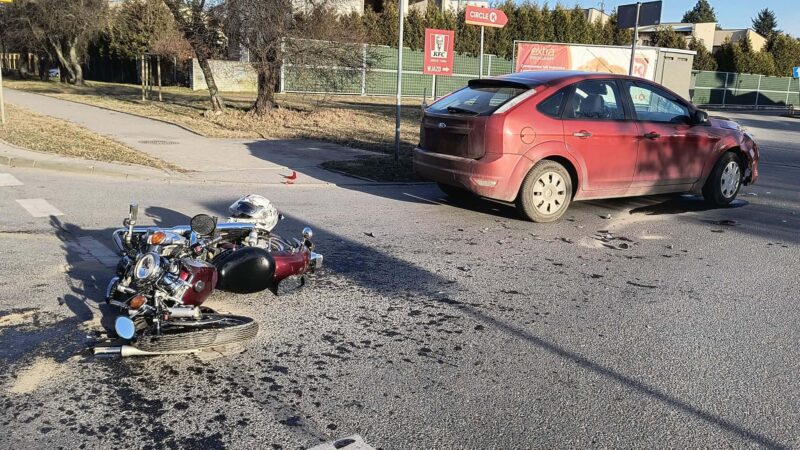 22-letni kierowca Forda, skręcając w lewo, nie ustąpił pierwszeństwa 17-letniemu motocykliście. W wyniku obrażeń karetka zabrała nastolatka do szpitala. Chłopak ma wymagane uprawnienia do kierowania jednośladem.