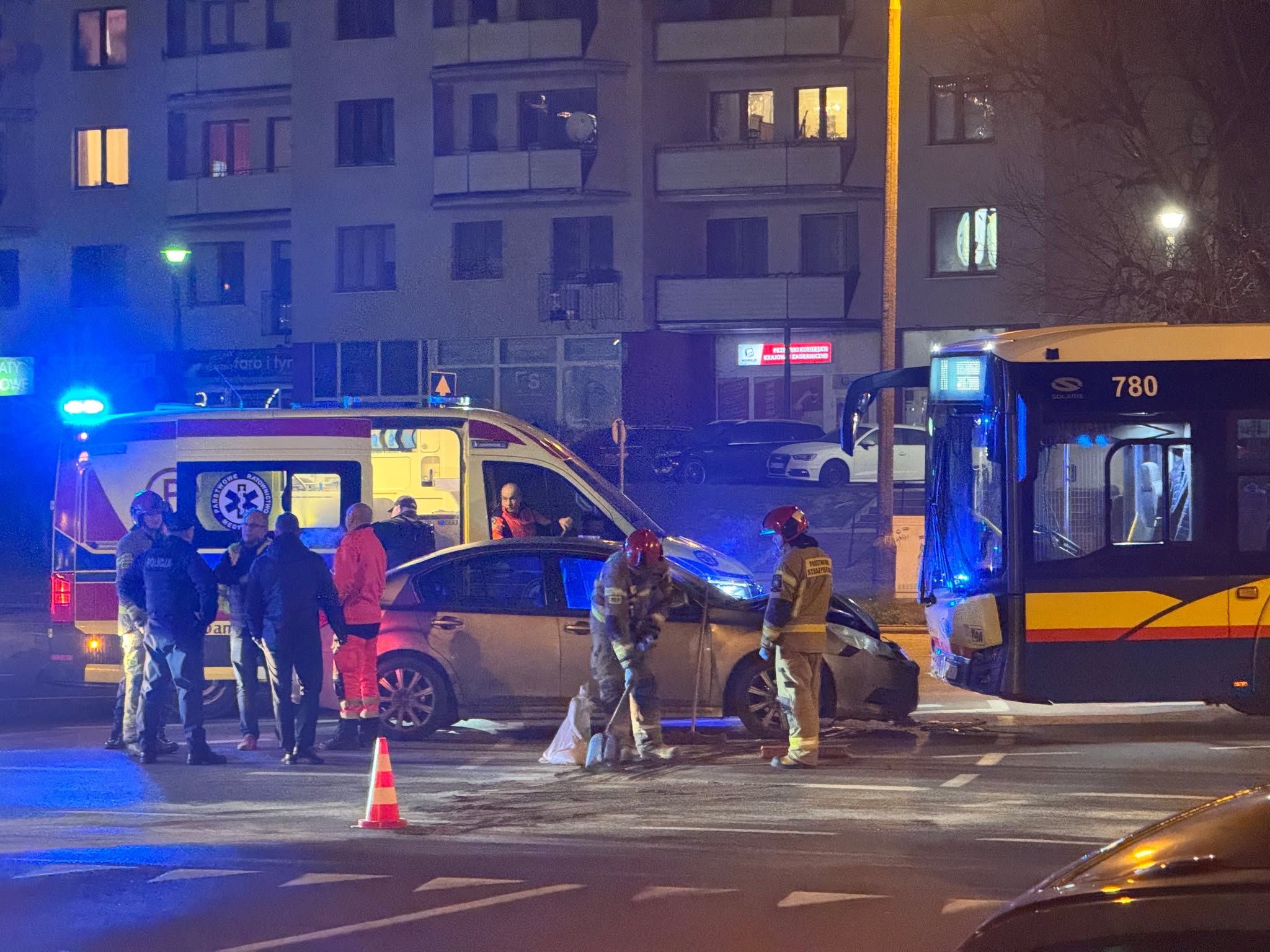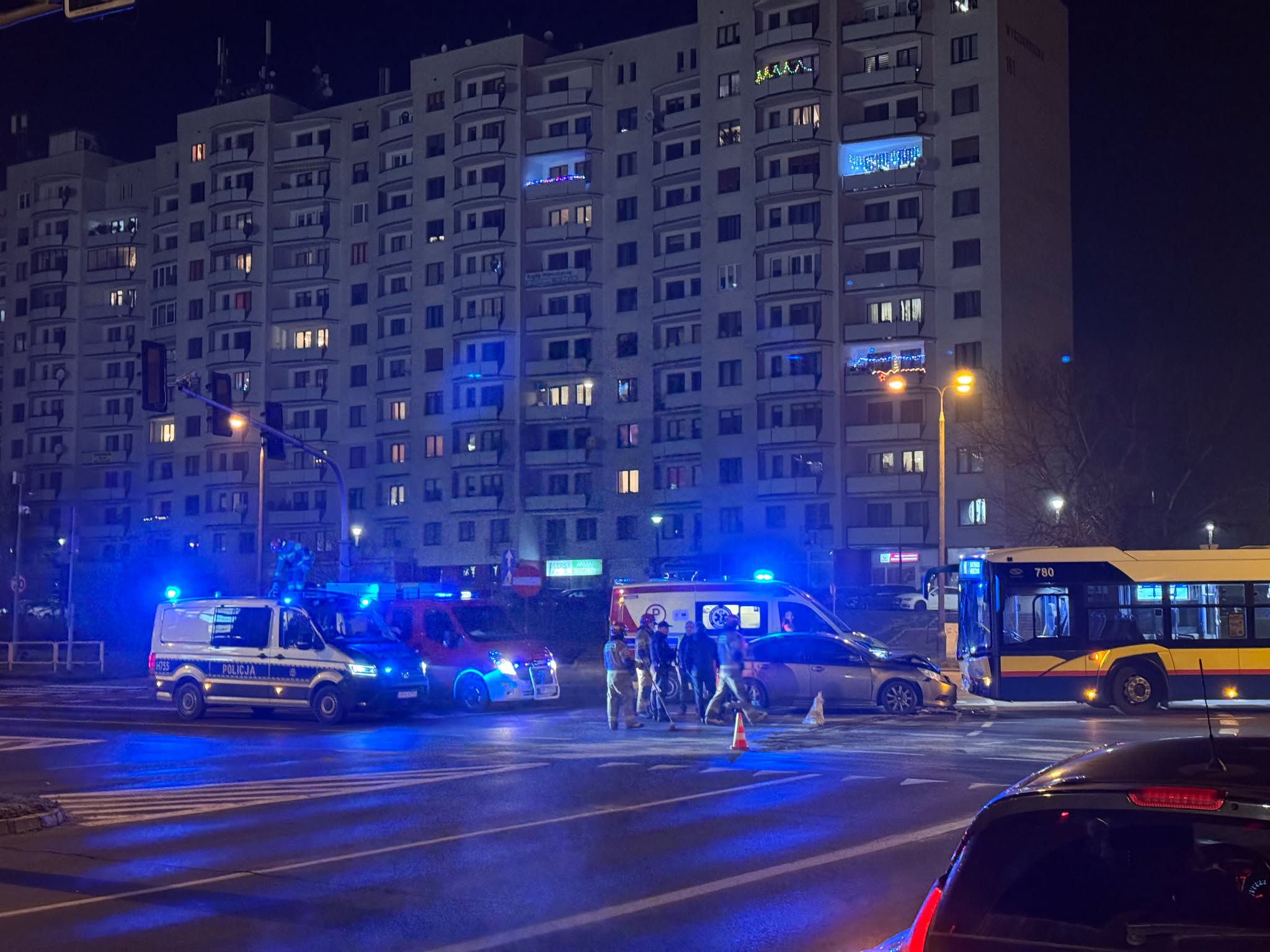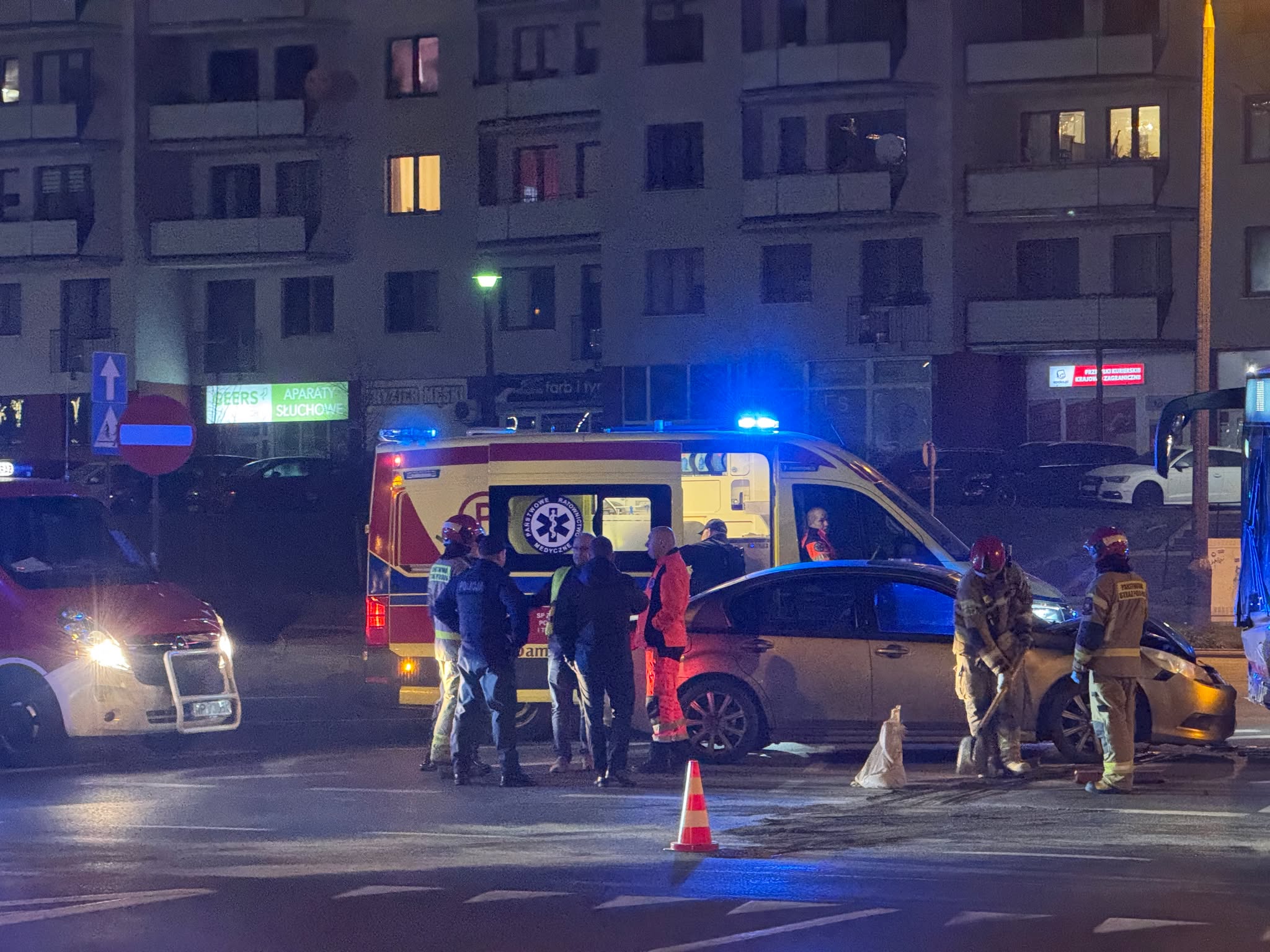 Osobówka zderzyła się z autobusem Komunikacji Miejskiej na Podolszycach. A dokładnie na dzielącym ich północną i południową część skrzyżowaniu Wyszogrodzkiej z al. Armii Krajowej i Jana Pawła II pod Galerią Wisła, wieżowcem zwanym szafą i Panoramą. Zdumienia okolicznościami kraksy w trakcie nocnych rozmów nie kryli członkowie grupy Night Driving Płock.