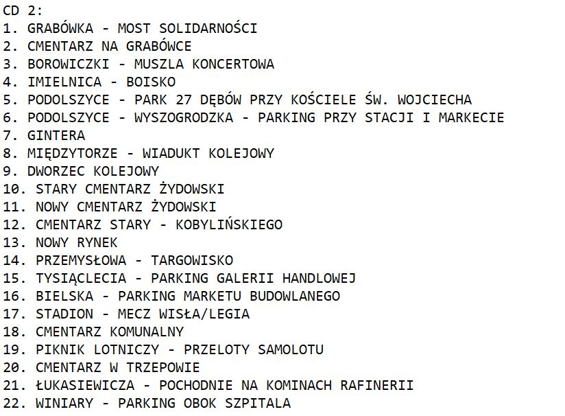Część lokalizacji na pierwszej i drugiej mapie pokrywa się, celem było pokazanie różnic i podobieństw w audiosferze tych miejsc. Myślę jednak, że to całościowy obraz prezentowany przez nagrania z tych wydawnictw pokazuje najwięcej, nie są one bowiem pomiarami akustycznymi, a w znacznej mierze subiektywną impresją na temat tego, jak brzmi miasto, działaniem na pograniczu dokumentu i sztuki dźwiękowej.