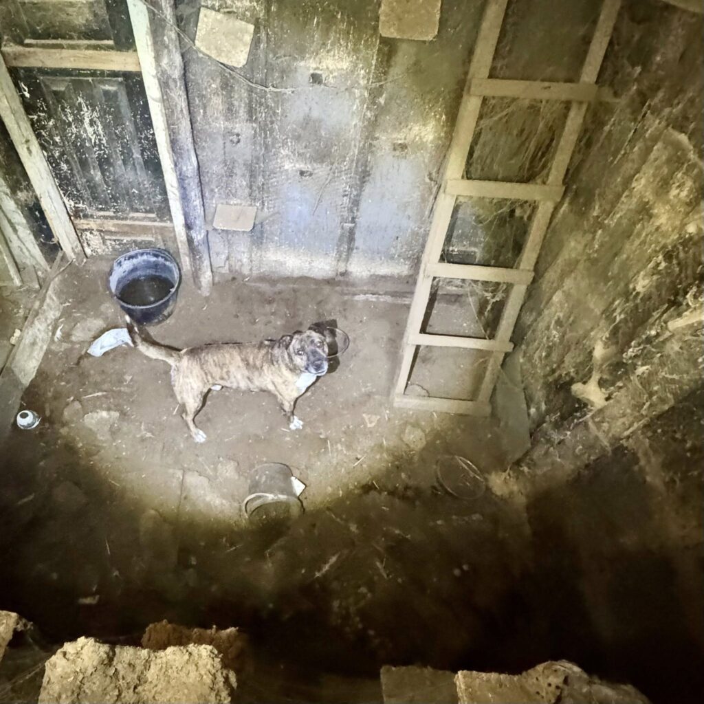 100P!łock. Zrujnowane, ciemne pomieszczenie, odchody, brak świeżej wody i wentylacji, a w środku pies