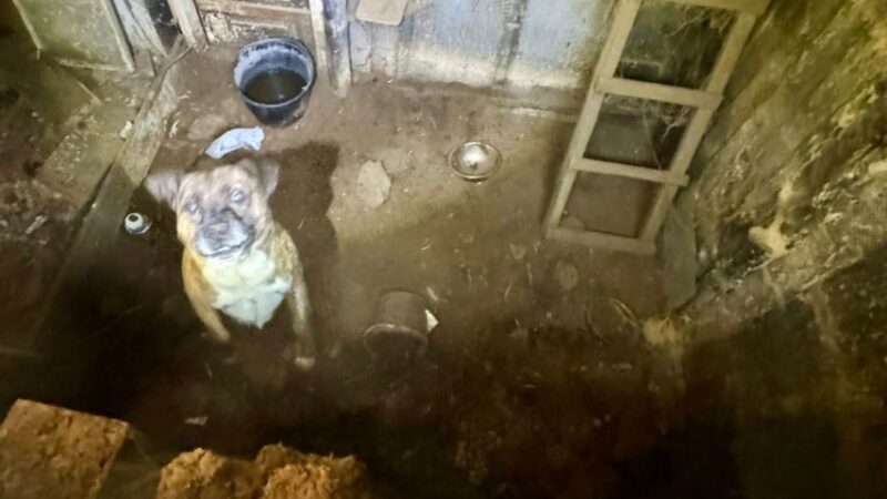 100P!łock. Zrujnowane, ciemne pomieszczenie, odchody, brak świeżej wody i wentylacji, a w środku pies