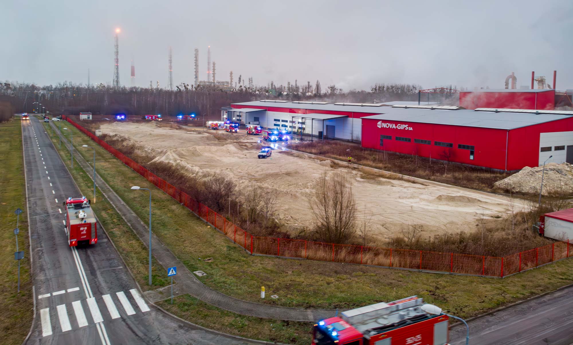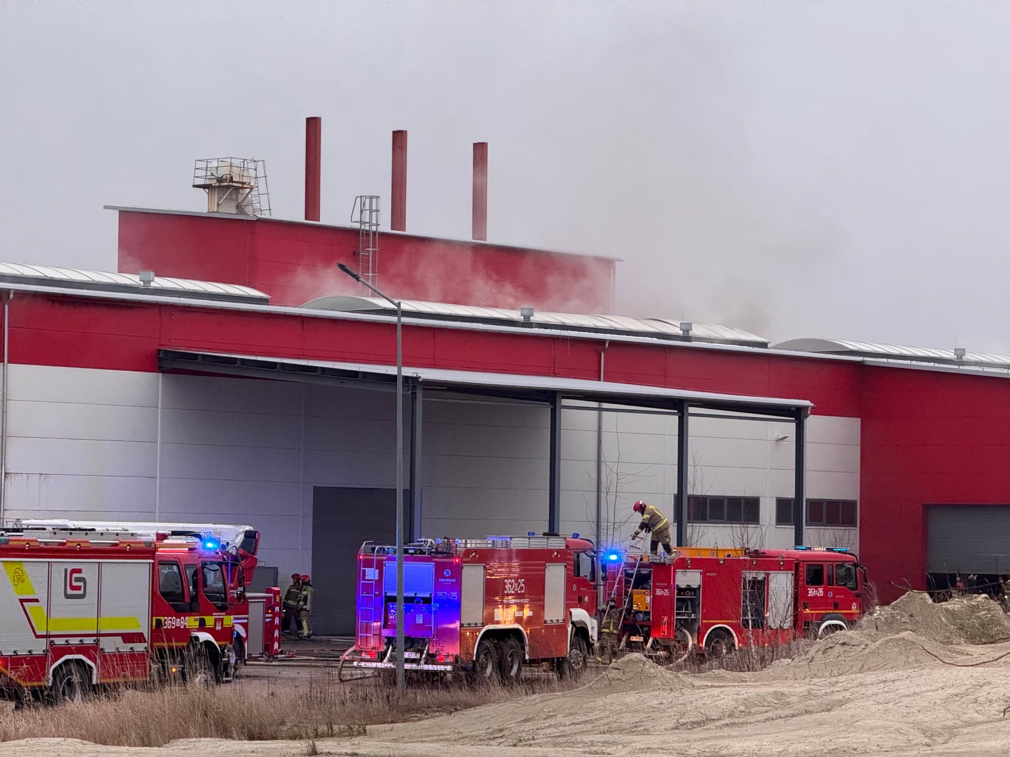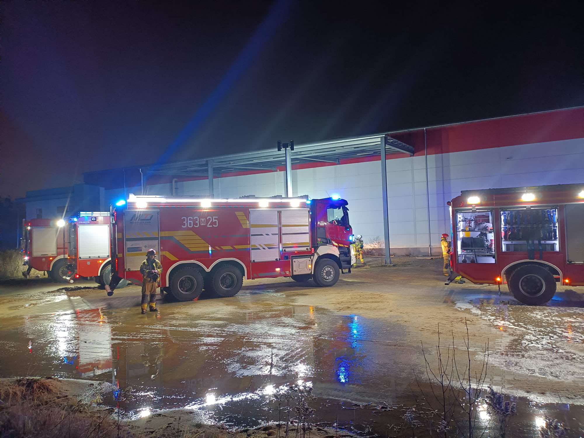 Na razie wiadomo, że pojechało tam 15 zastępów straży pożarnej. Większość zgromadziła się w pobliżu hali firmy Nova-Gips. Strażacy lokalizują źródło ognia i sprawdzają, czy w środku nikogo nie ma.