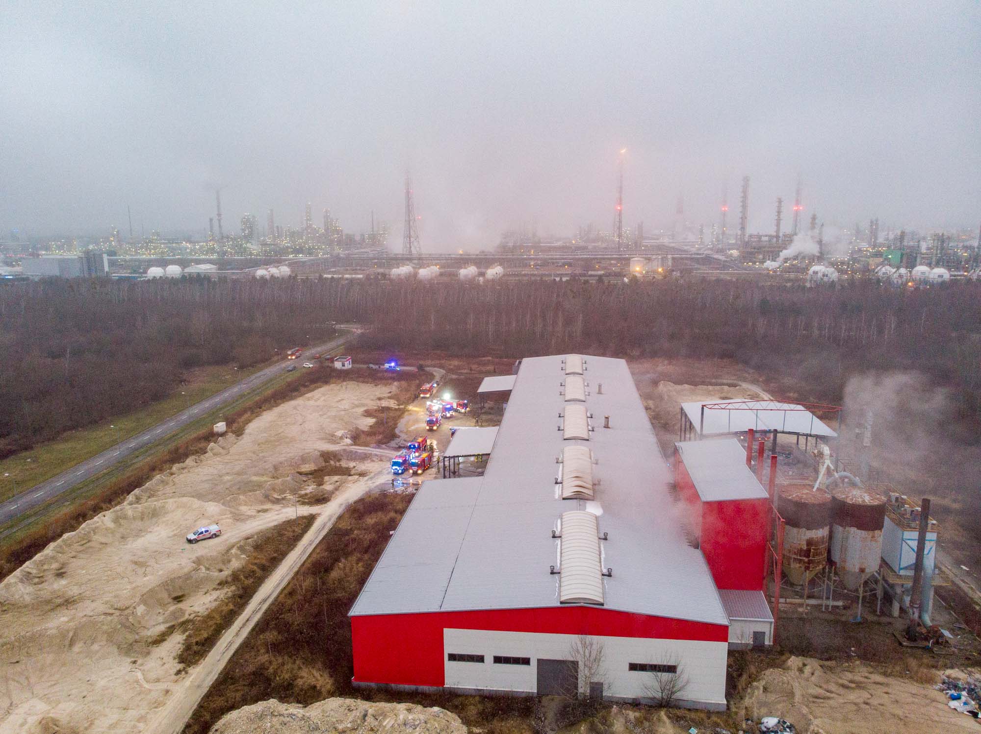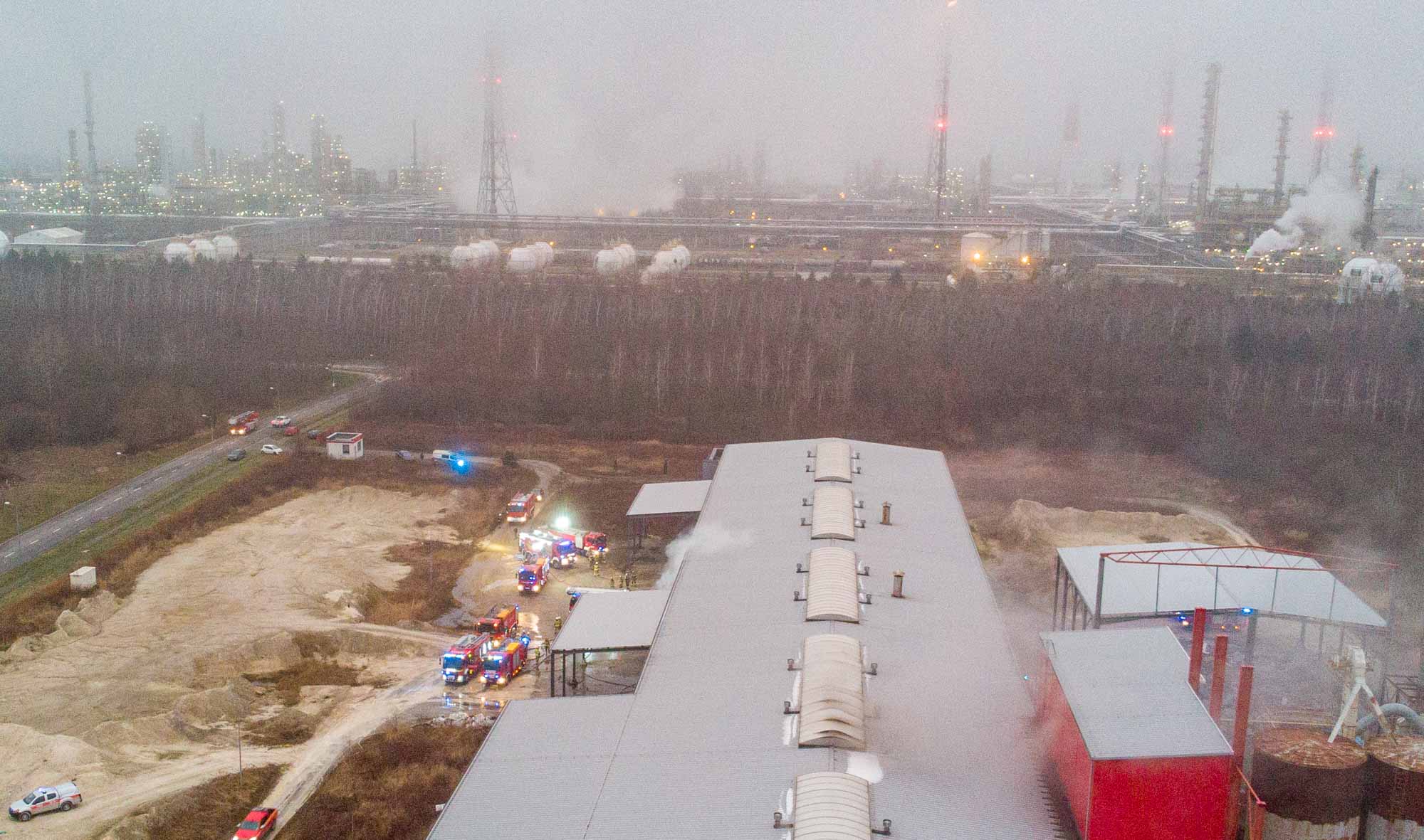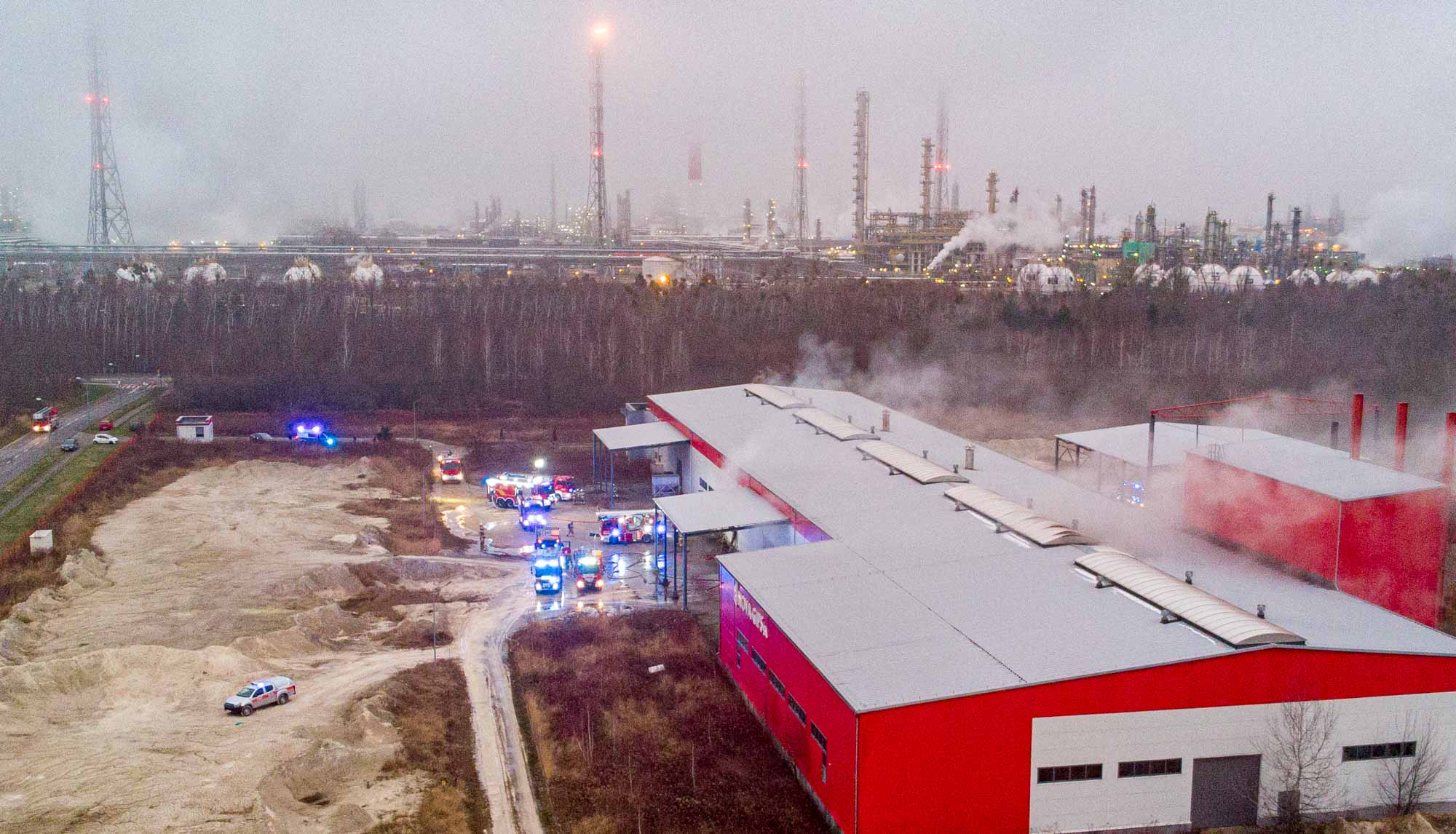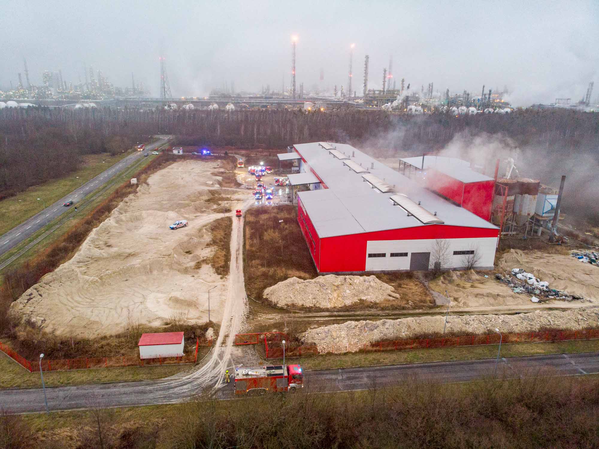 Na razie wiadomo, że pojechało tam 15 zastępów straży pożarnej. Większość zgromadziła się w pobliżu hali firmy Nova-Gips. Strażacy lokalizują źródło ognia i sprawdzają, czy w środku nikogo nie ma.