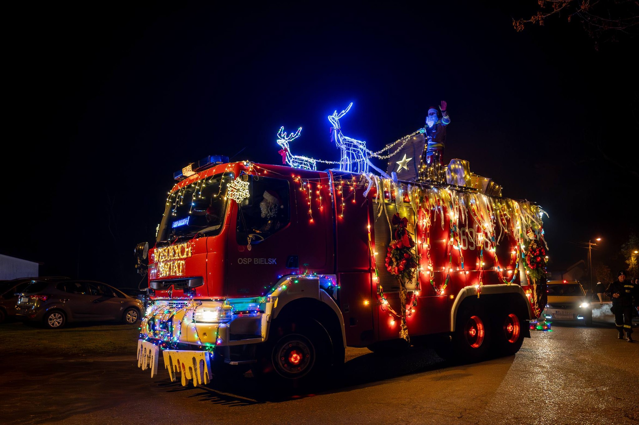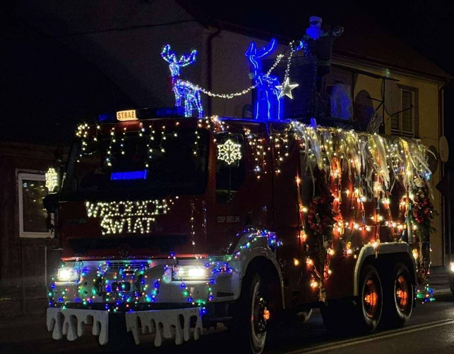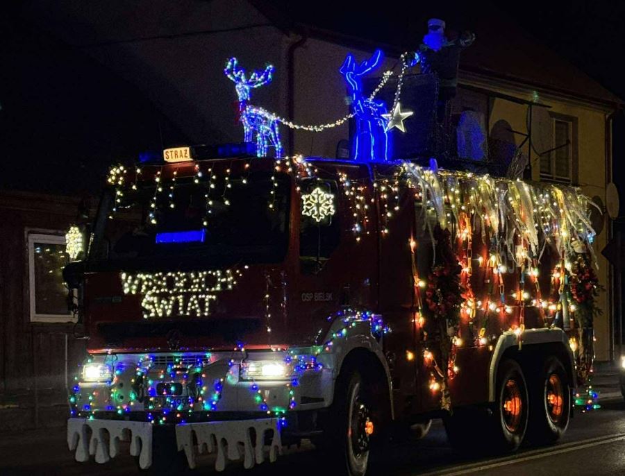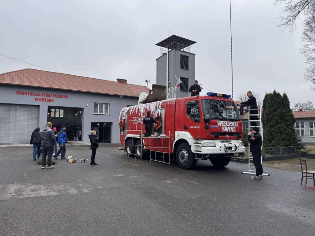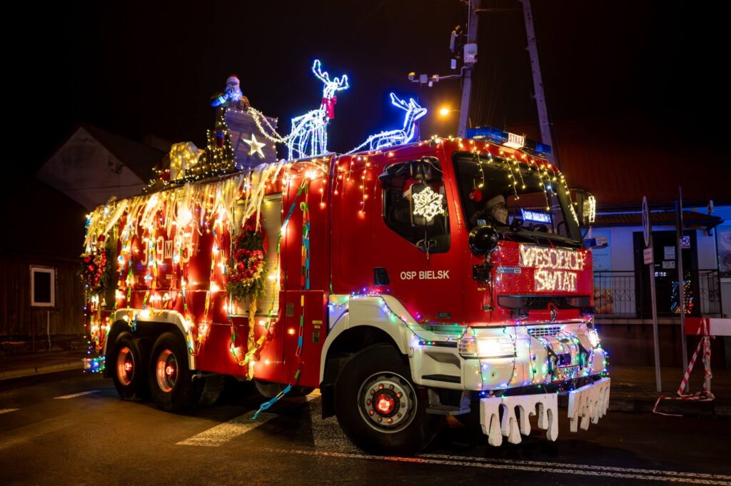 Swój samochód druhowie z Ochotniczej Straży Pożarnej w Bielsku dekorowali od samego rana: oświetlili, świątecznie przysposobili; nie skłamie, kto powie, że może nawet nieco przesadnie… 🙂