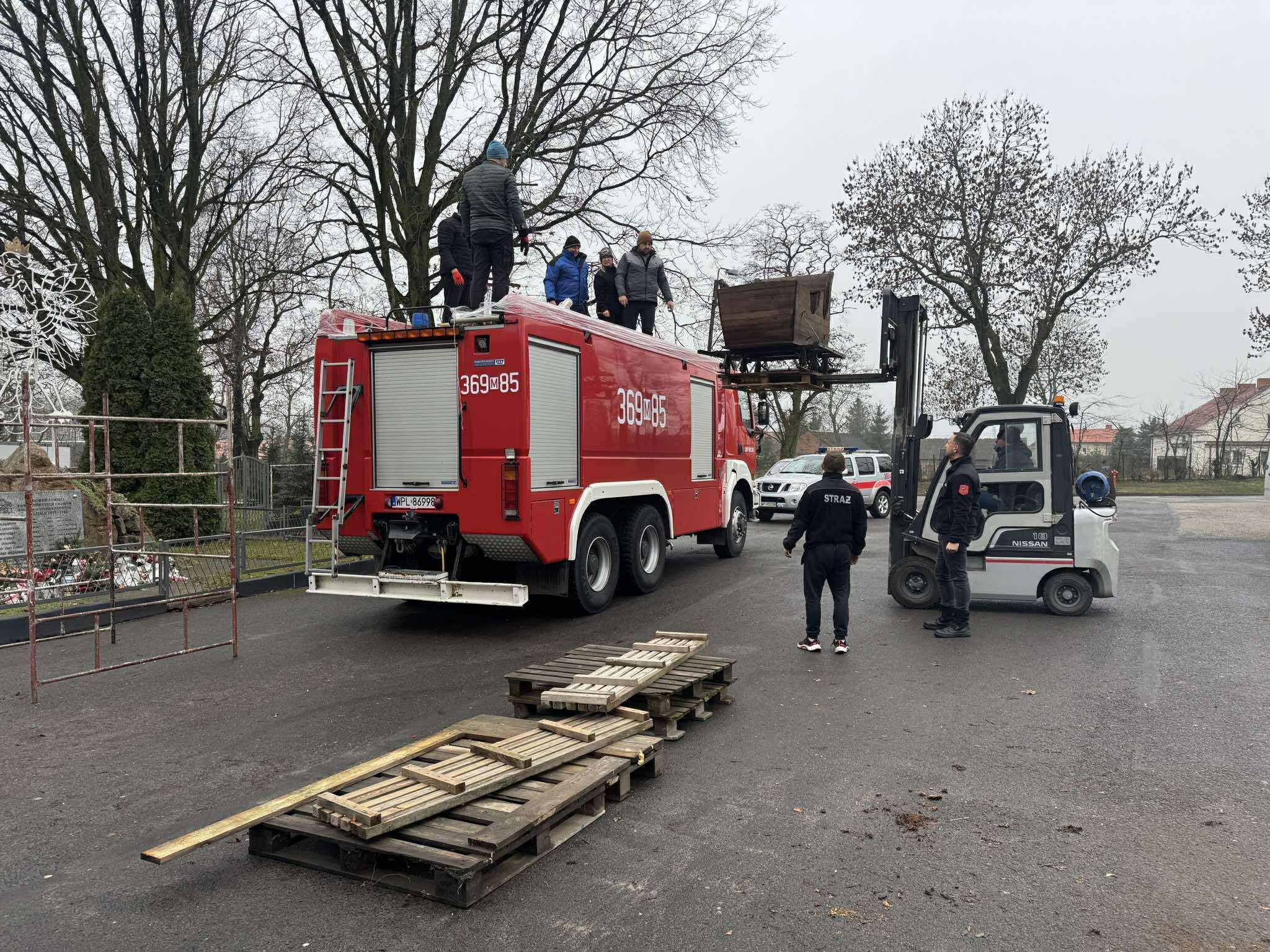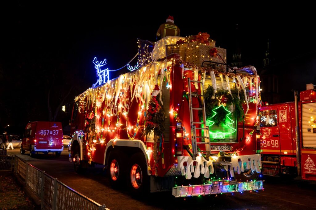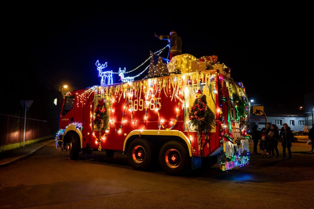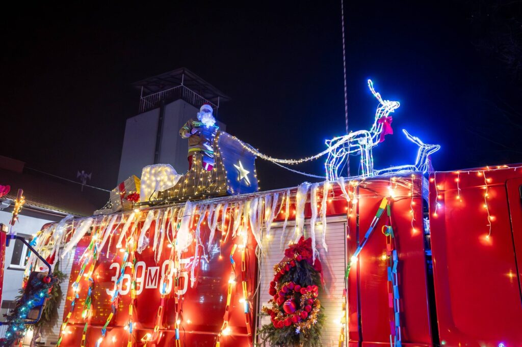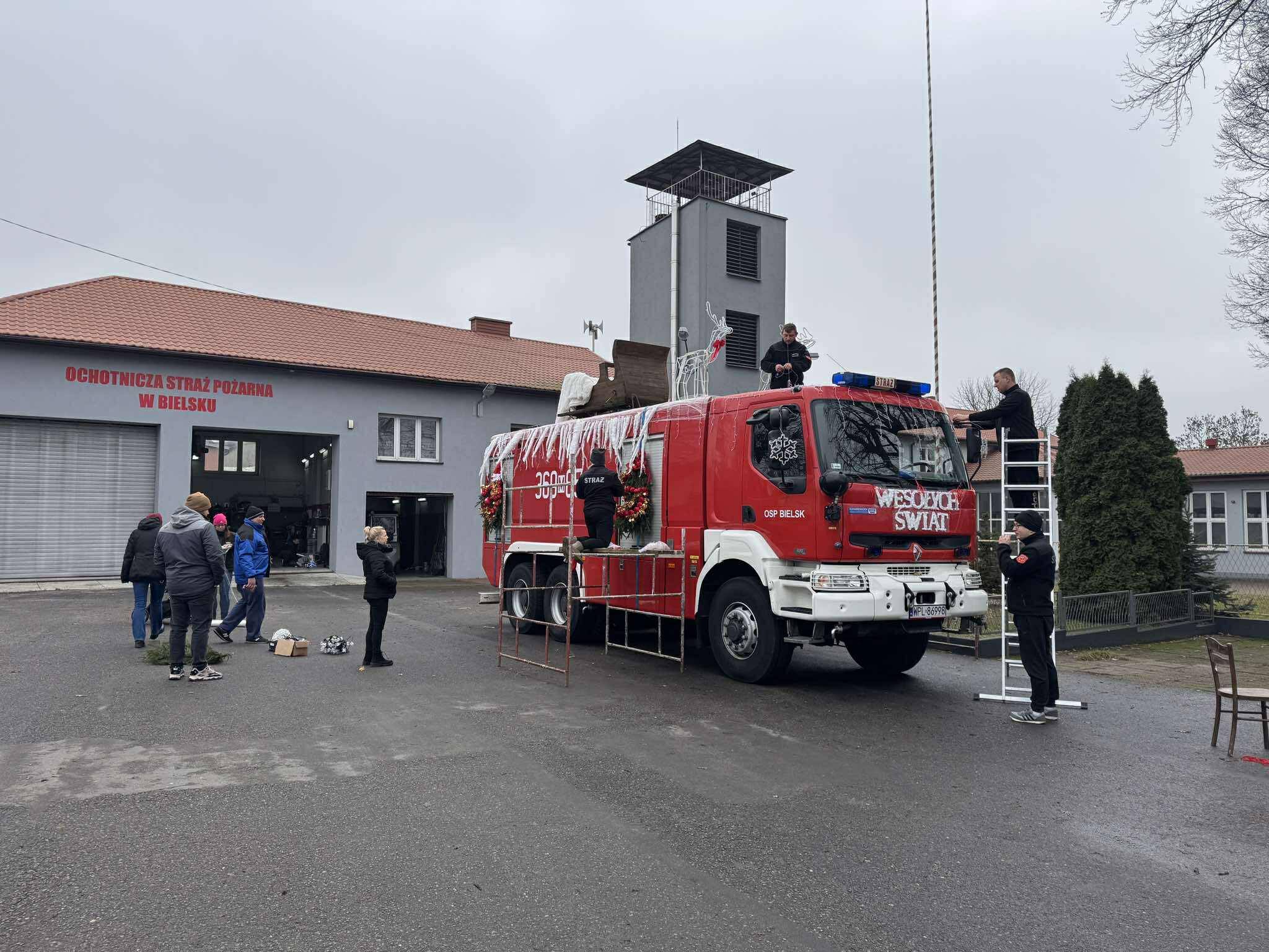 Swój samochód druhowie z Ochotniczej Straży Pożarnej w Bielsku dekorowali od samego rana: oświetlili, świątecznie przysposobili; nie skłamie, kto powie, że może nawet nieco przesadnie… 🙂