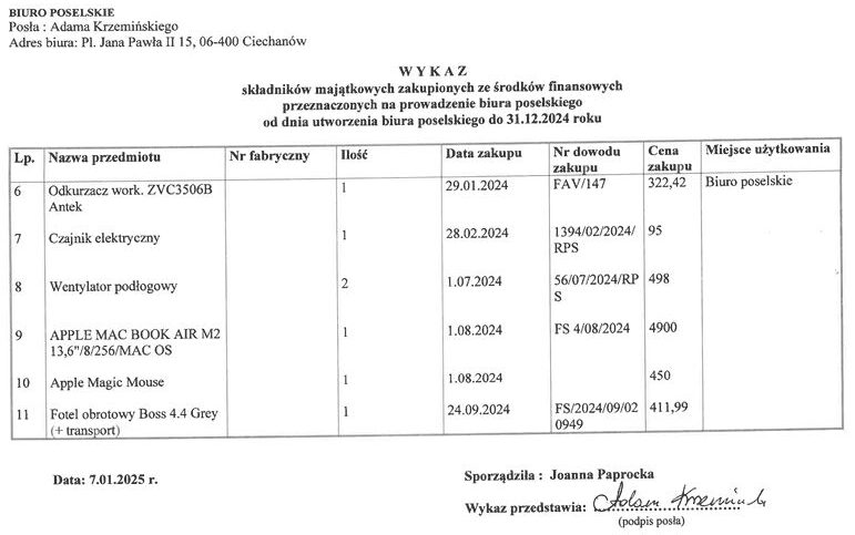 - inne wydatki związane z prowadzeniem biura poselskiego: kwiaty i wiązanki – 8 235 zł, art. spożywcze – 3 764 zł, nagrody – 4 266 zł.