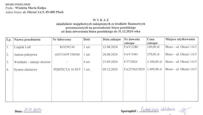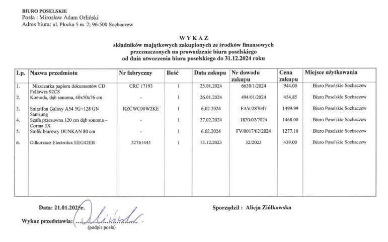 Oto sprawozdania z wydatkowania kwoty ryczałtu przeznaczonego na prowadzenie biura poselskiego – od dnia utworzenia biura do 31 grudnia 2024 r. Prezentujemy wybrane punkty zestawień.