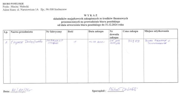 - koszty konserwacji i naprawy sprzętu technicznego biura poselskiego oraz koszty jego eksploatacji – 0 zł