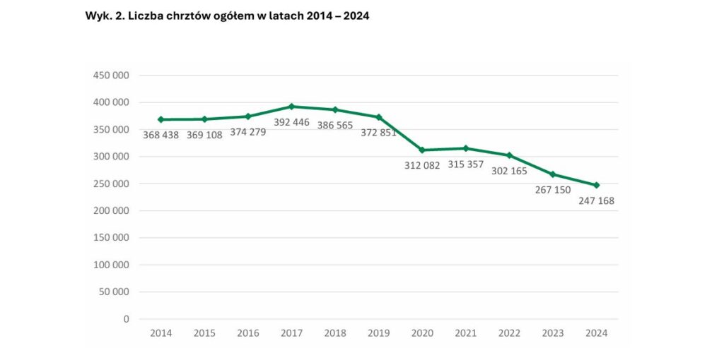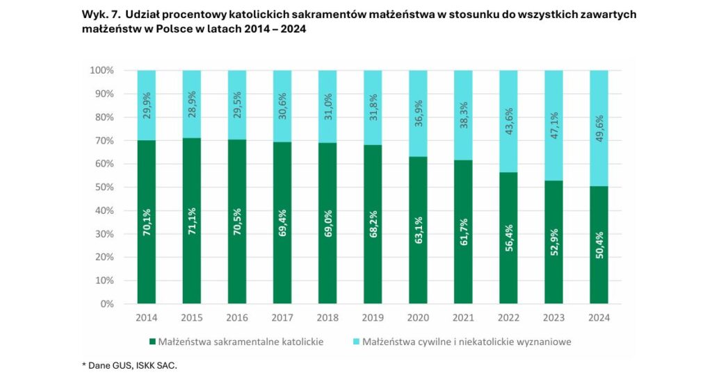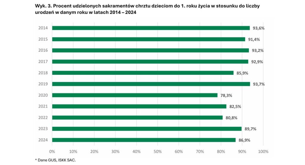 „W 2024 roku sakrament Chrztu św. udzielono 247,2 tys. osobom, czyli o 7,5 p. proc. mniej niż w roku poprzednim. Do I Komunii św. przystąpiło prawie 320 tys. osób (spadek o 1,5 p. proc.). W przypadku sakramentu bierzmowania przyjęło go blisko 213 tys. osób (spadek o 27,6 p. proc.). Sakrament małżeństwa został udzielony 68,3 tys. parom (spadek o 11,6 p. proc.). Liczby dotyczące sakramentów ilustrują trend demograficzny i przemiany kulturowe polskiego społeczeństwa – zmiany wyznawanych wartości. Na poziomie sakramentów zauważalne są przemiany demograficzne i kulturowe. Spadki liczby chrztów i ślubów związane są bowiem ze zmianami demograficznymi (spadek liczby urodzeń), natomiast spadek liczby zawieranych sakramentalnych małżeństw jest skutkiem zmian kulturowych”.