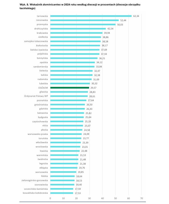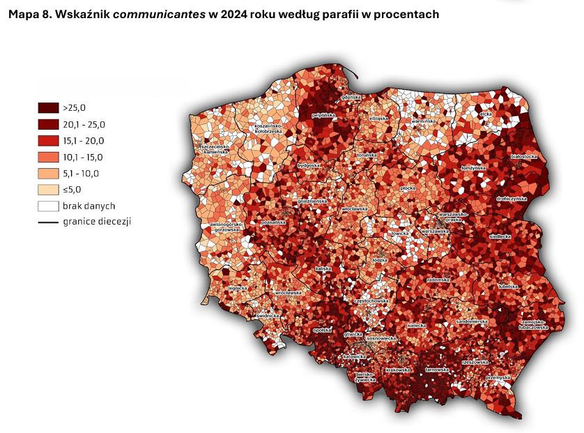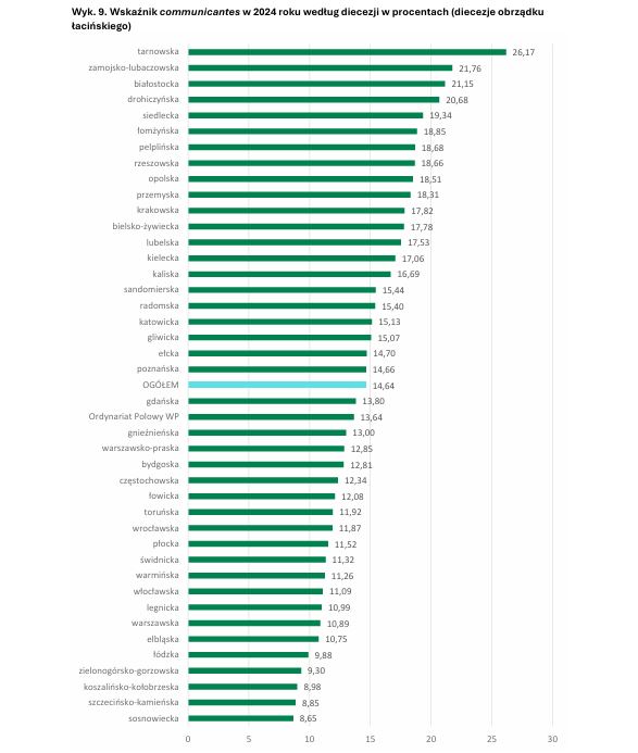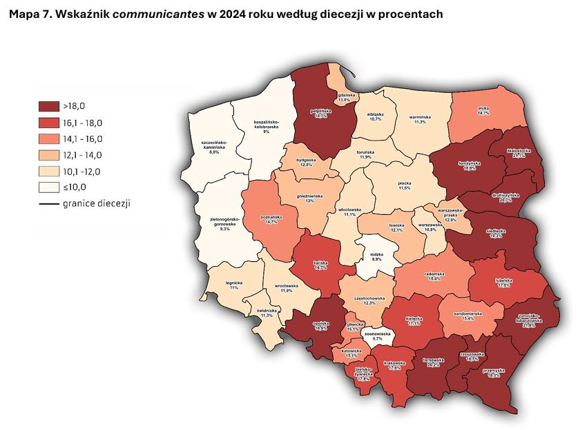 … to „statystyczny wskaźnik informujący o procencie osób przyjmujących komunię św. w trakcie niedzielnych mszy św. względem liczby osób obecnych na mszy św.”. Średnia krajowa wynosi tu 49,51 proc. Najwyższy odsetek jest w diecezji ełckiej – 58,64 proc. W płockiej – 46,85 proc. (wzrósł w porównaniu z 2023 r.), co daje 10. miejsce w kraju.