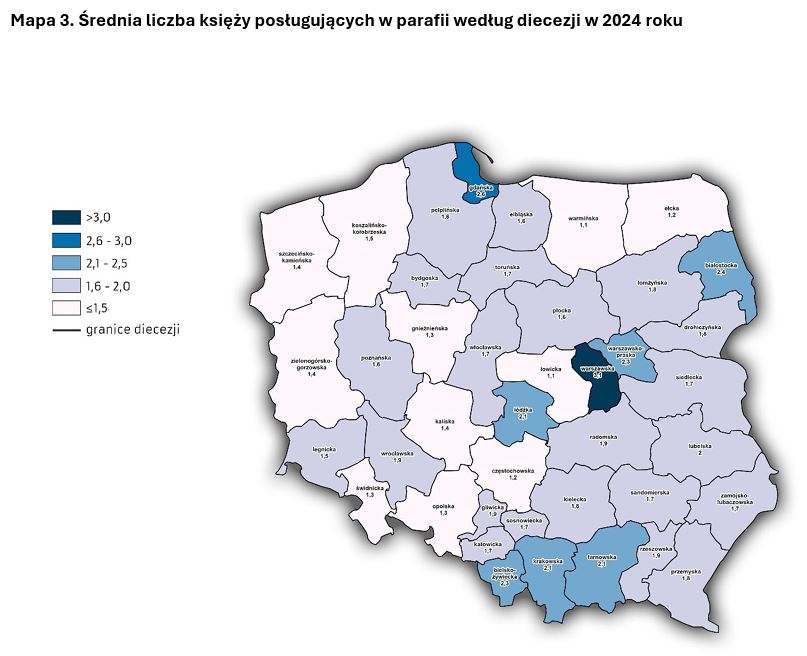 W Polsce jest ponad 40 diecezji, w porównaniu z 2018 r. w całym kraju liczba inkardynowanych, czyli przypisanych do nich księży zmalała o 6,4 proc. W diecezji płockiej odsetek ten wyniósł minus 10,7 proc. (w 2018 r. było tu 610, a w 2024 – 545 księży), jeszcze większy spadek był tylko w dwóch innych: