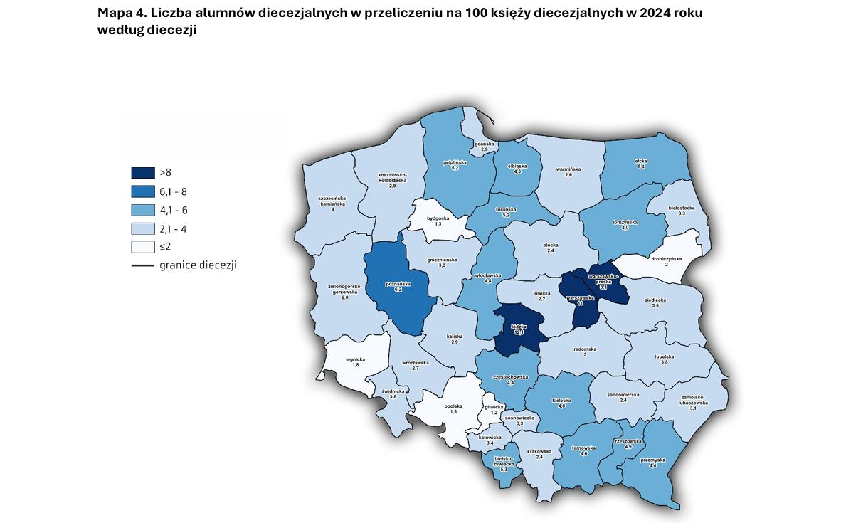 W Polsce jest ponad 40 diecezji, w porównaniu z 2018 r. w całym kraju liczba inkardynowanych, czyli przypisanych do nich księży zmalała o 6,4 proc. W diecezji płockiej odsetek ten wyniósł minus 10,7 proc. (w 2018 r. było tu 610, a w 2024 – 545 księży), jeszcze większy spadek był tylko w dwóch innych: