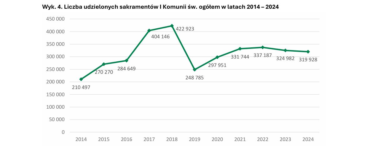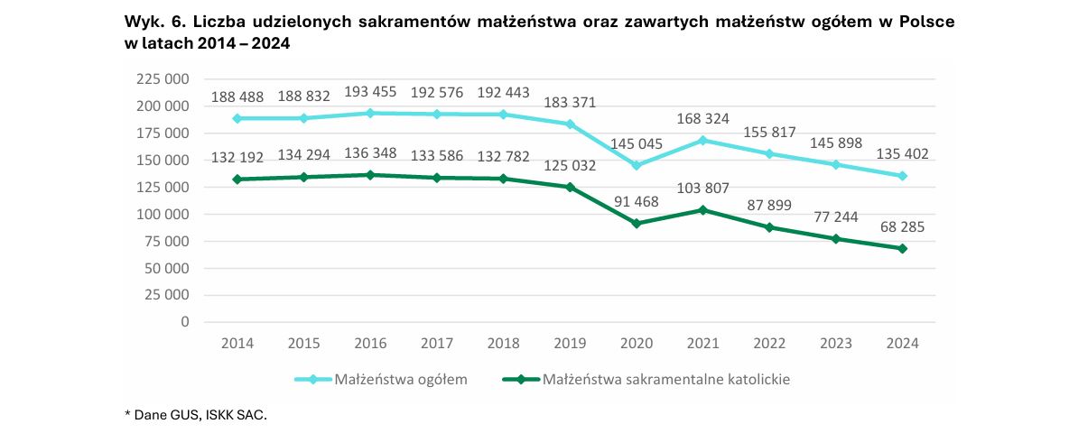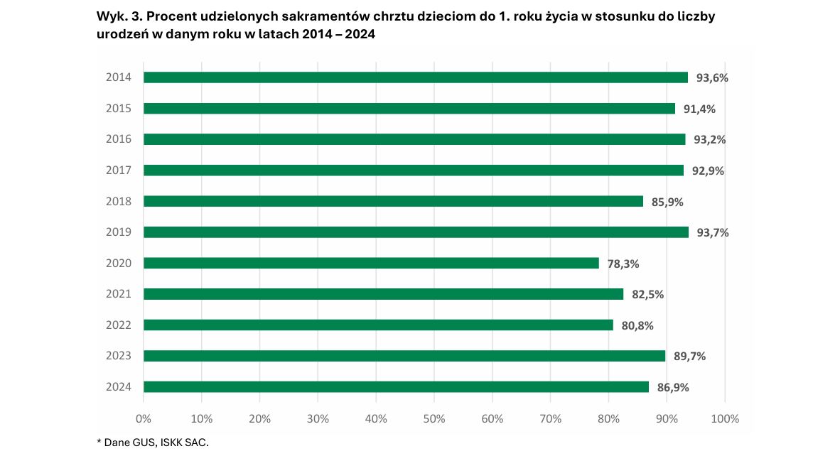 „W 2024 roku sakrament Chrztu św. udzielono 247,2 tys. osobom, czyli o 7,5 p. proc. mniej niż w roku poprzednim. Do I Komunii św. przystąpiło prawie 320 tys. osób (spadek o 1,5 p. proc.). W przypadku sakramentu bierzmowania przyjęło go blisko 213 tys. osób (spadek o 27,6 p. proc.). Sakrament małżeństwa został udzielony 68,3 tys. parom (spadek o 11,6 p. proc.). Liczby dotyczące sakramentów ilustrują trend demograficzny i przemiany kulturowe polskiego społeczeństwa – zmiany wyznawanych wartości. Na poziomie sakramentów zauważalne są przemiany demograficzne i kulturowe. Spadki liczby chrztów i ślubów związane są bowiem ze zmianami demograficznymi (spadek liczby urodzeń), natomiast spadek liczby zawieranych sakramentalnych małżeństw jest skutkiem zmian kulturowych”.