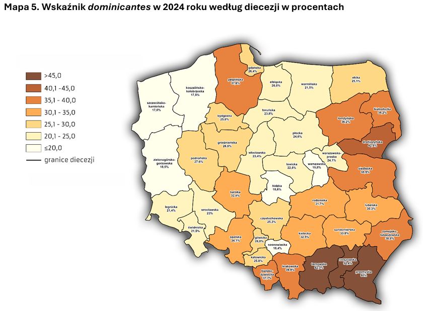 Drugi trend dotyczy wiernych – „stabilizują się statystyki dotyczące praktyk religijnych”, niemal we wszystkich diecezjach w ostatnich pocovidowych latach rosną wskaźniki dominicantes i communicantes. „Można zauważyć, że spadek praktyk wywołanych ograniczeniami epidemicznymi zatrzymał się”.