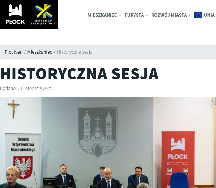 Jest też inna relacja z sesji – urzędu marszałkowskiego. Zaczyna się tak: „Po raz pierwszy w historii samorządu Mazowsza sesja sejmiku odbyła się poza jego siedzibą. Radni województwa obradowali dziś w płockim ratuszu. Rozpoczęli prace nad budżetem województwa na 2026 r. oraz przyjęli m.in. przyszłoroczny program współpracy z organizacjami pozarządowymi”.
