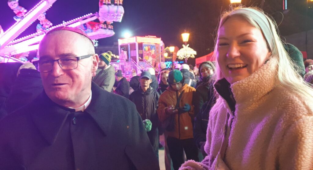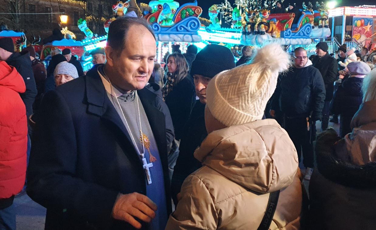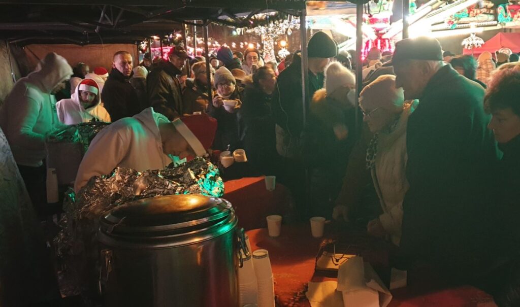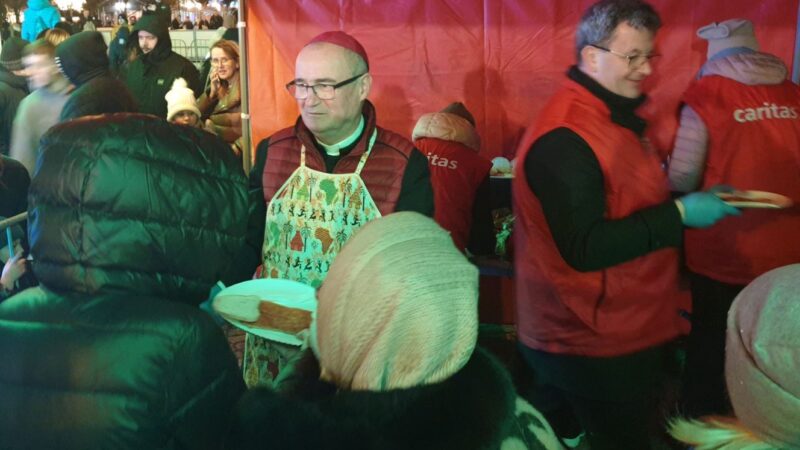 I wreszcie można było spróbować wigilijnego posiłku. Pod wielkim namiotem uwijał się bp Stułkowski – Caritas Diecezji Płockiej zaserwowała pół tysiąca porcji mintaja w panierce. Ordynariusz diecezji zawiązał fartuch, chwycił za talerze. „Smacznego” – życzył kolejnym płocczanom. Towarzyszyli mu m.in. ukraińscy wolontariusze z Centrum Pomocy Migrantom i Uchodźcom, Warto dodać, że jak chętnie brali udział w przygotowaniu świątecznego posiłku, tak wcześniej uczestniczyli też w zbiórce żywności „Tak. Pomagam!” w sklepach.