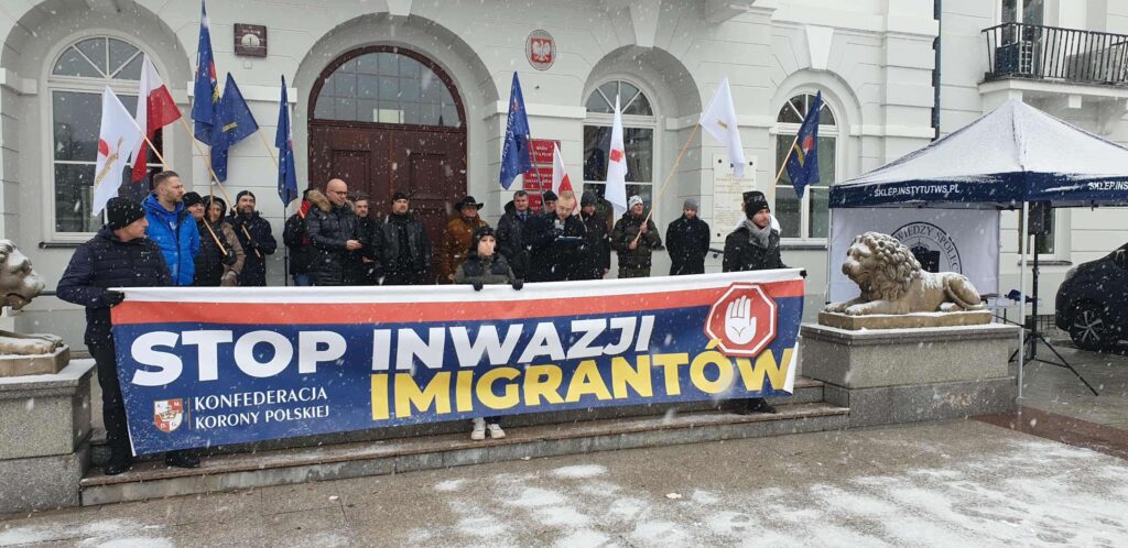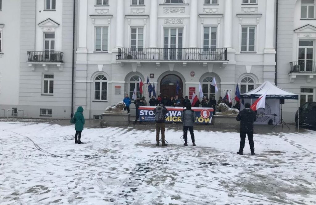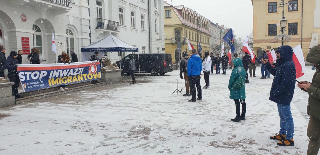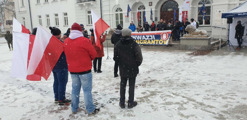 Konfederacja Korony Polskiej, partia Grzegorza Brauna, od dłuższego czasu zachęcała do udziału w antyimigranckiej manifestacji przed ratuszem. Odpowiedziało ok. 40 osób, w tej grupie – organizatorzy, zaproszeni przez nich mówcy, ludzie z partyjnymi flagami. Pozostałych – w miejscu dla publiczności – w kulminacyjnym momencie kilkanaście, maks 20 osób. Pod koniec manifestacji – kilka.