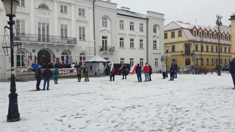 Konfederacja Korony Polskiej, partia Grzegorza Brauna, od dłuższego czasu zachęcała do udziału w antyimigranckiej manifestacji przed ratuszem. Odpowiedziało ok. 40 osób, w tej grupie – organizatorzy, zaproszeni przez nich mówcy, ludzie z partyjnymi flagami. Pozostałych – w miejscu dla publiczności – w kulminacyjnym momencie kilkanaście, maks 20 osób. Pod koniec manifestacji – kilka.