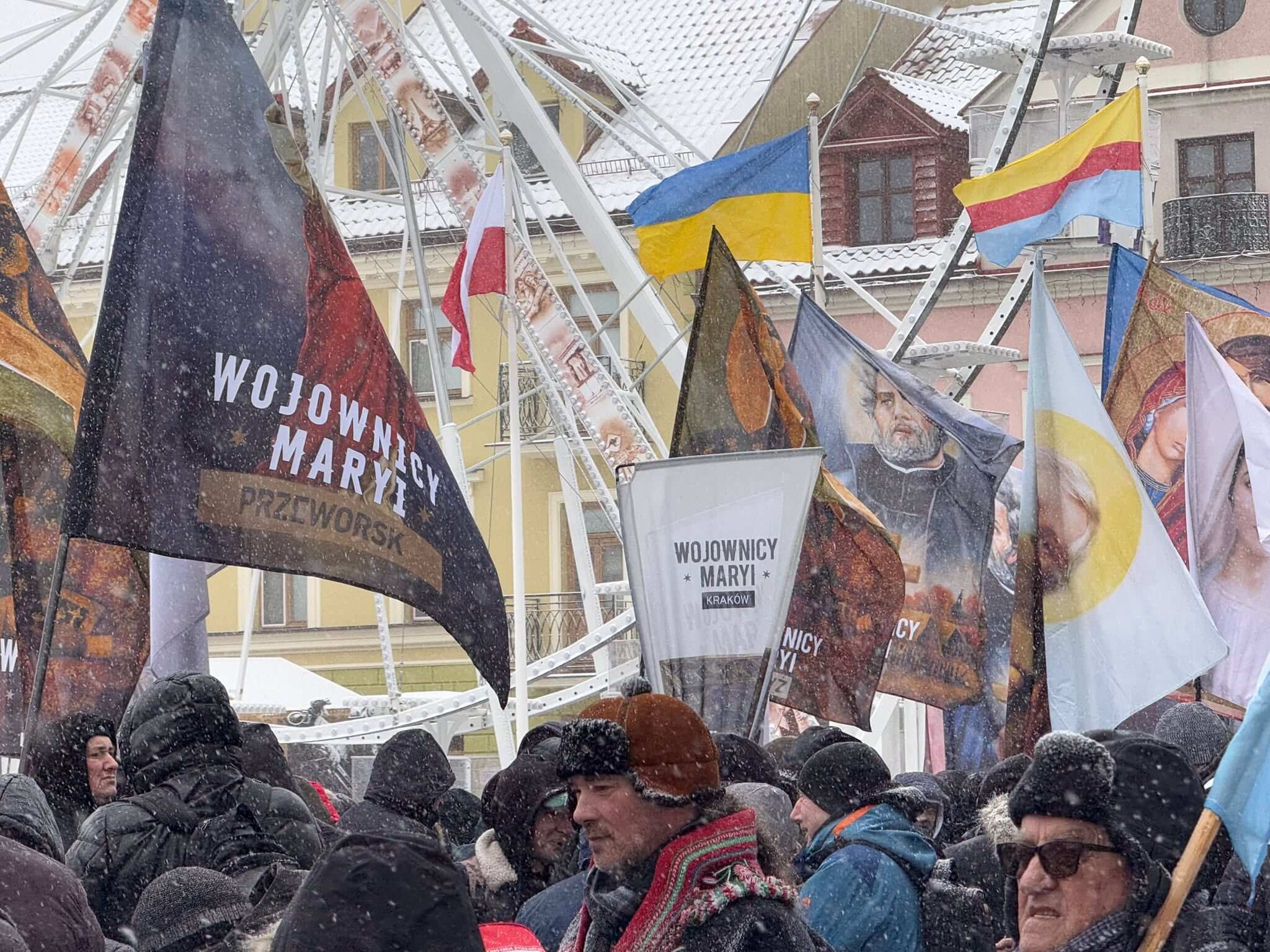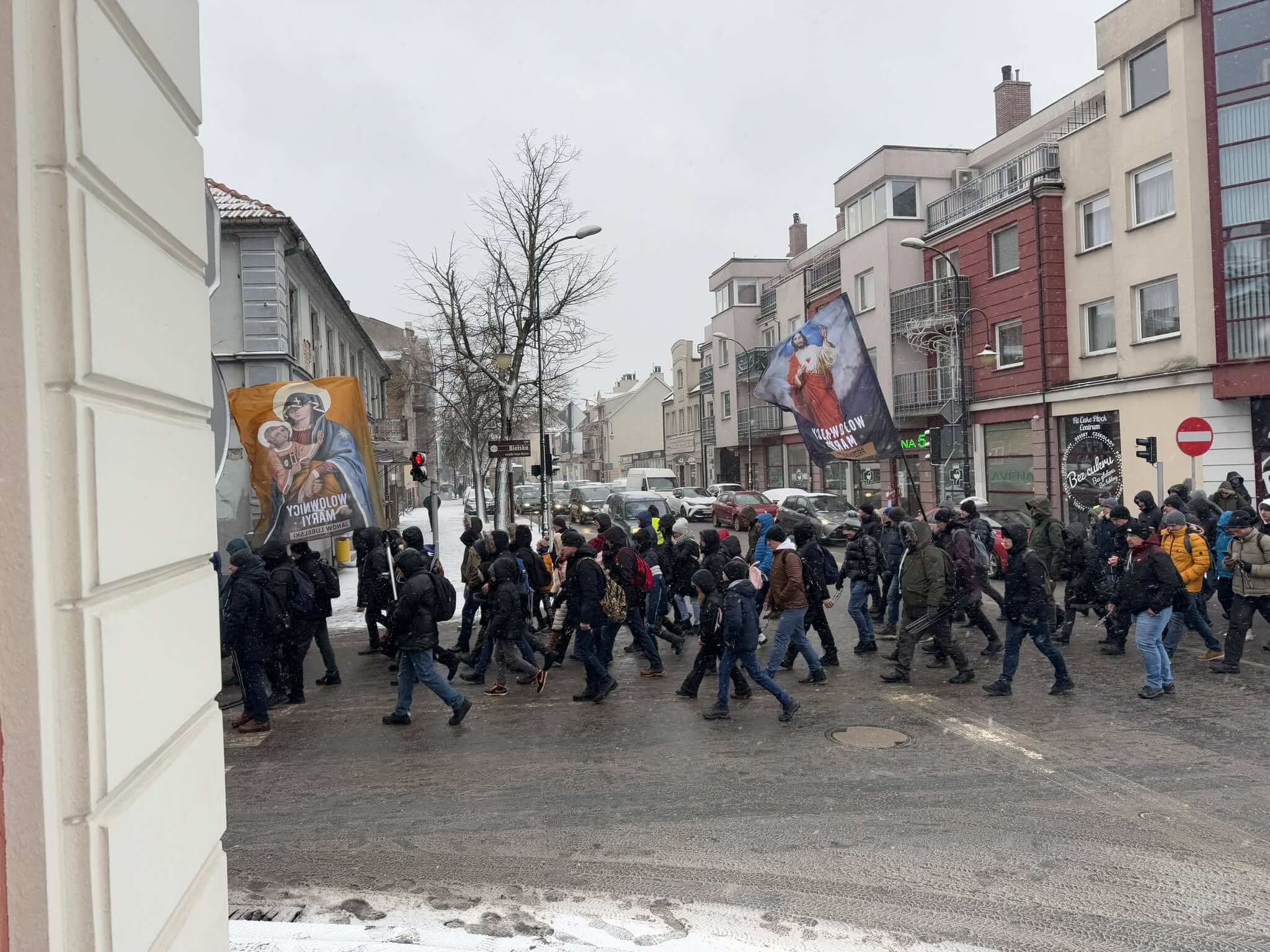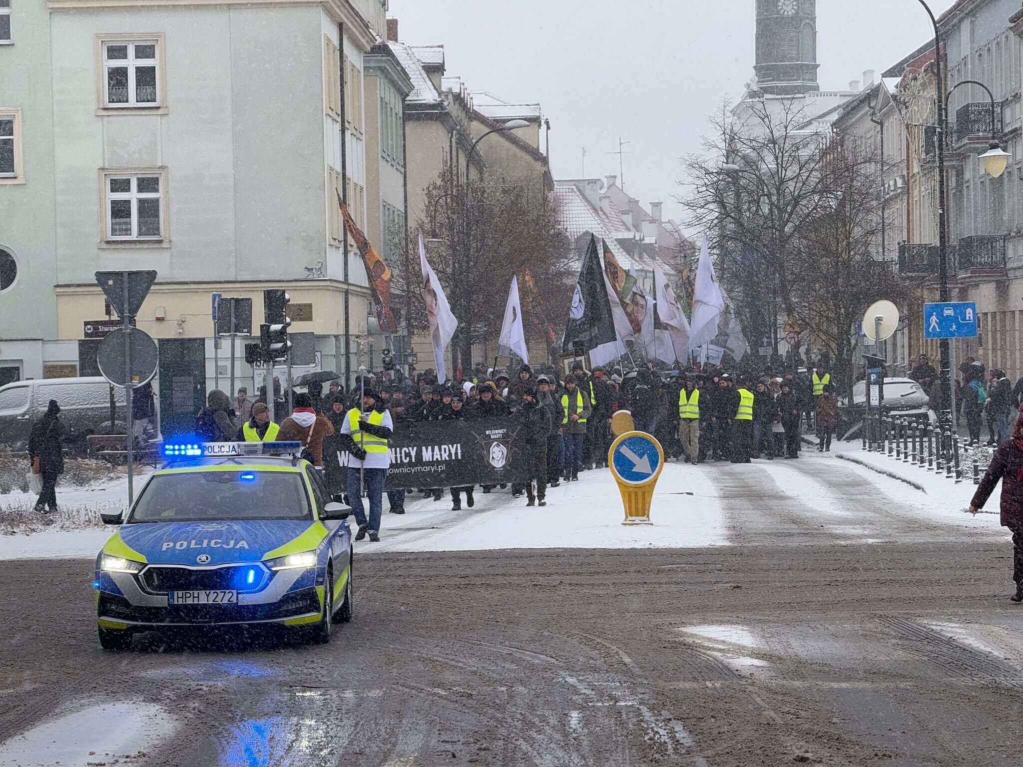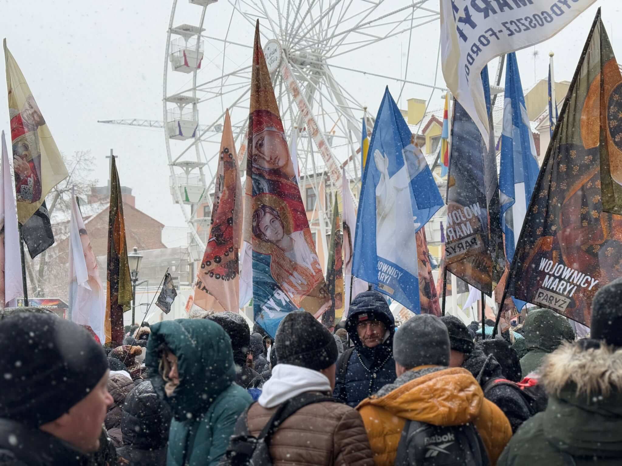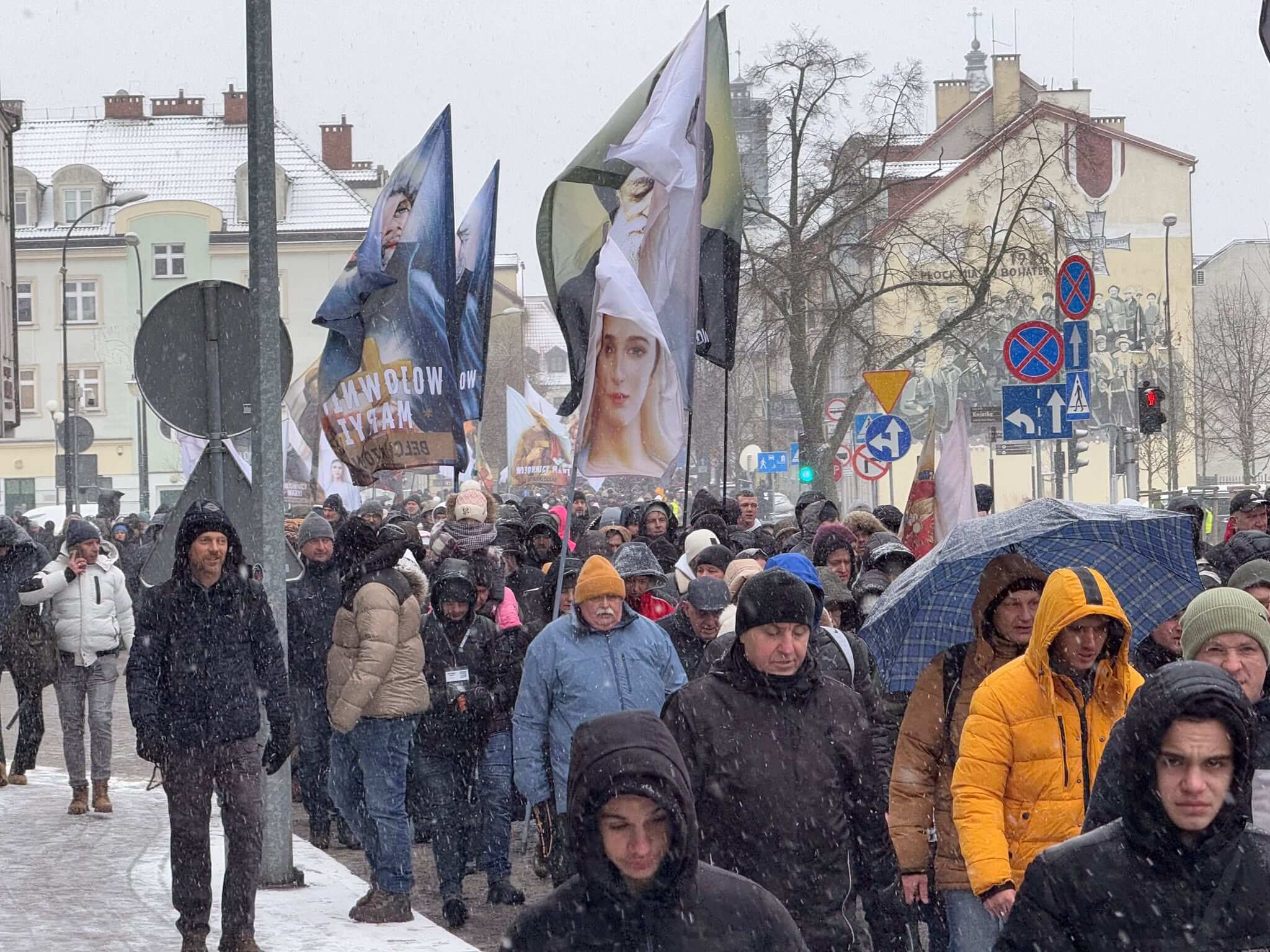 Wojownicy Maryi w Płocku. Z wielkimi flagami i różańcem w dłoniach przeszli ze Starego Rynku do Orlen Areny [FOTO, WIDEO]