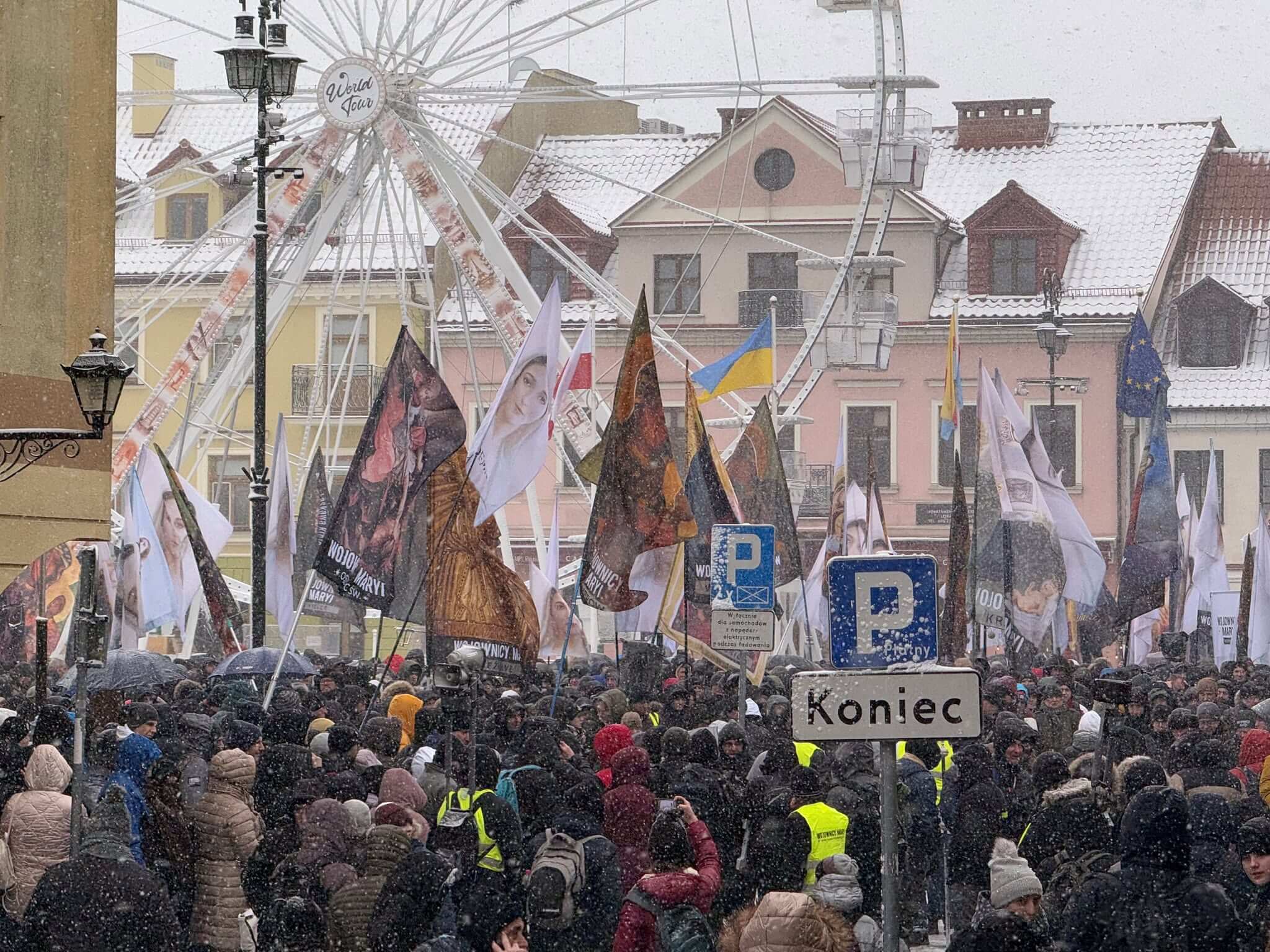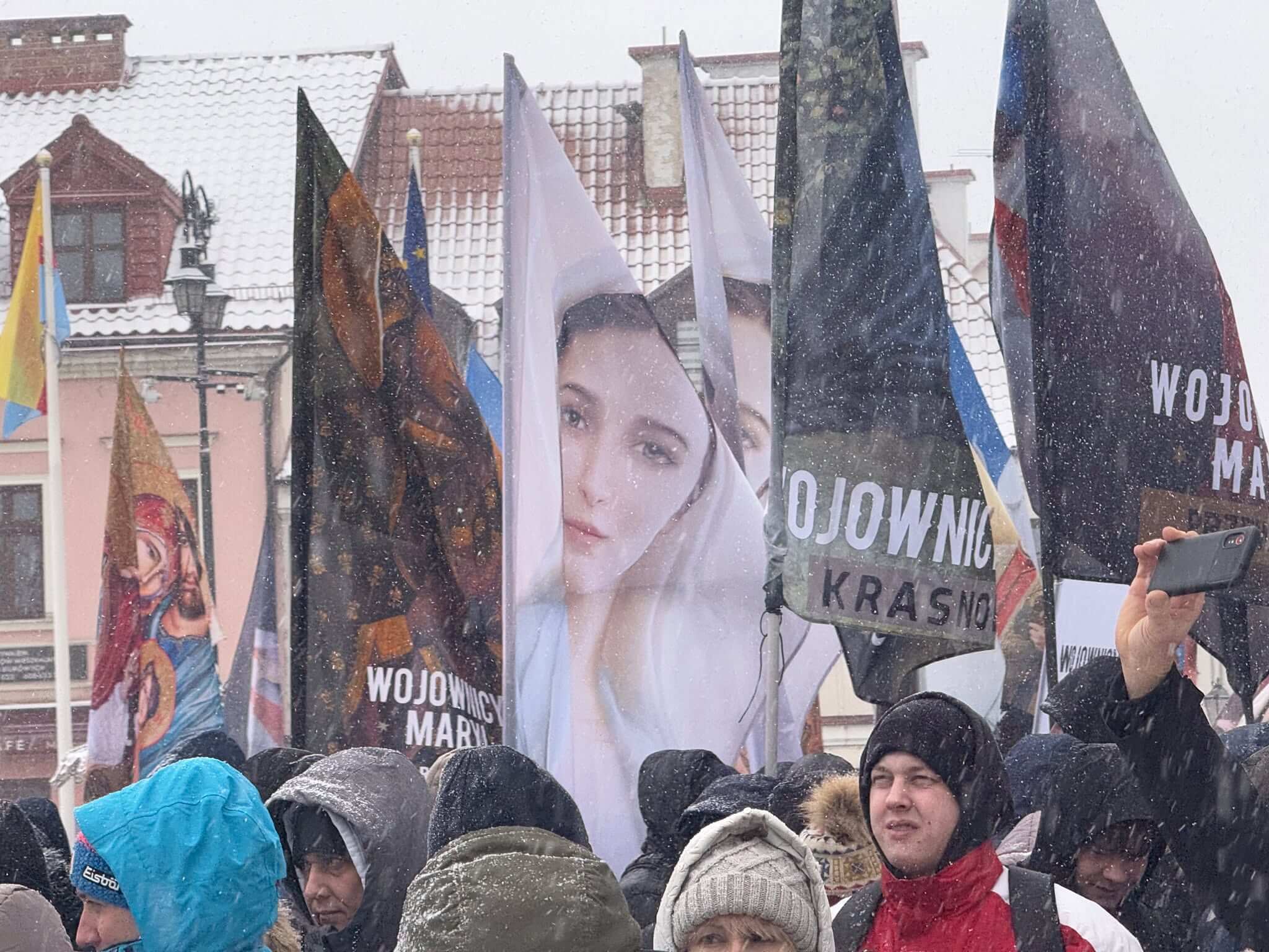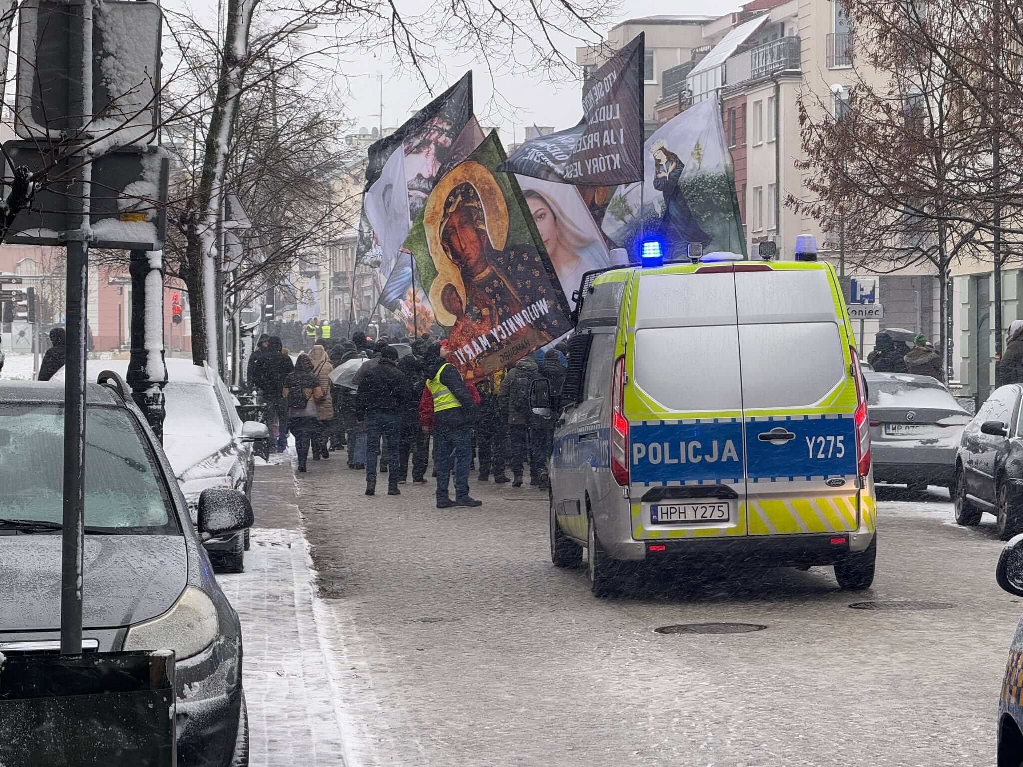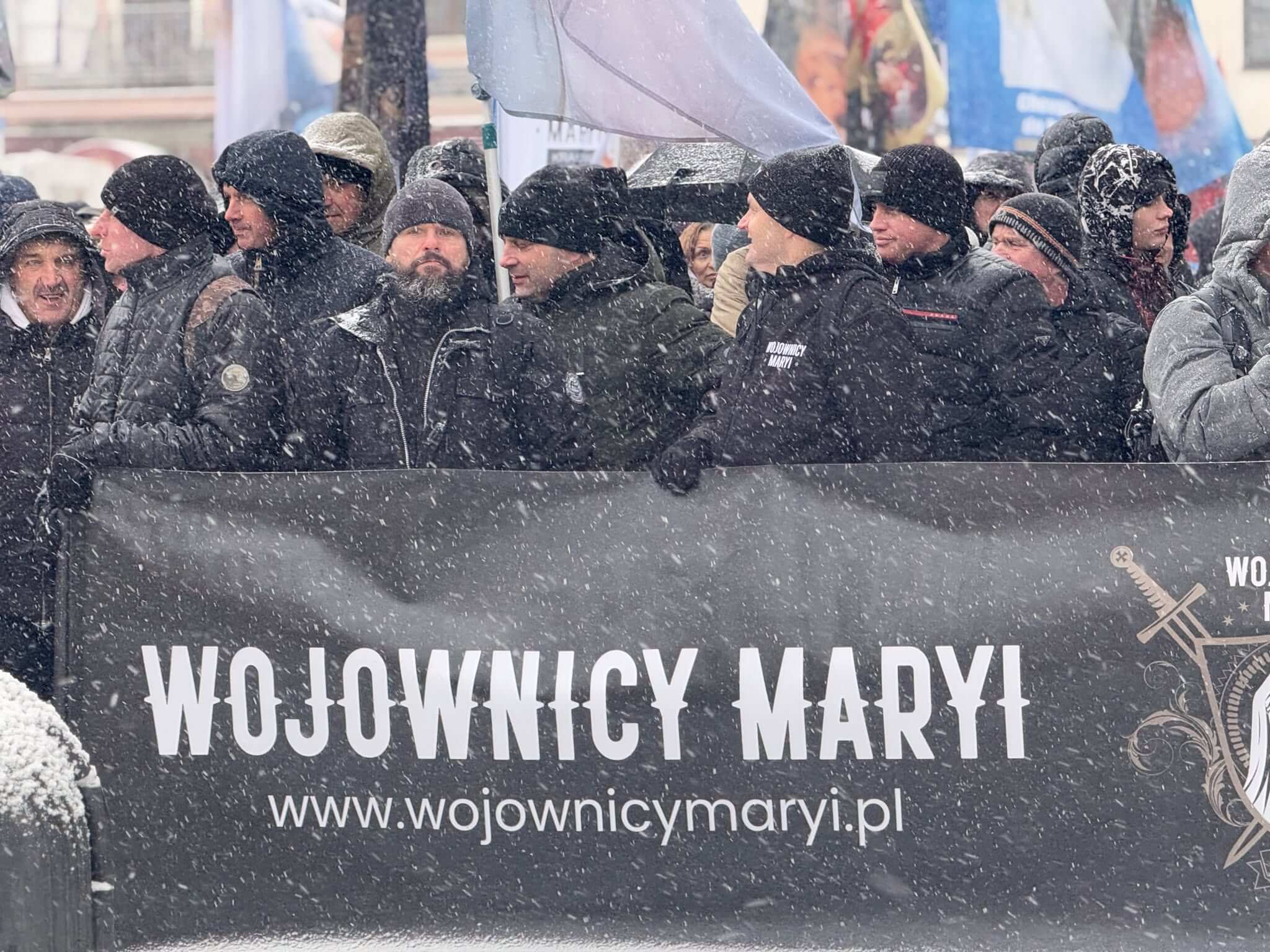 Wojownicy Maryi w Płocku. Z wielkimi flagami i różańcem w dłoniach przeszli ze Starego Rynku do Orlen Areny [FOTO, WIDEO]
