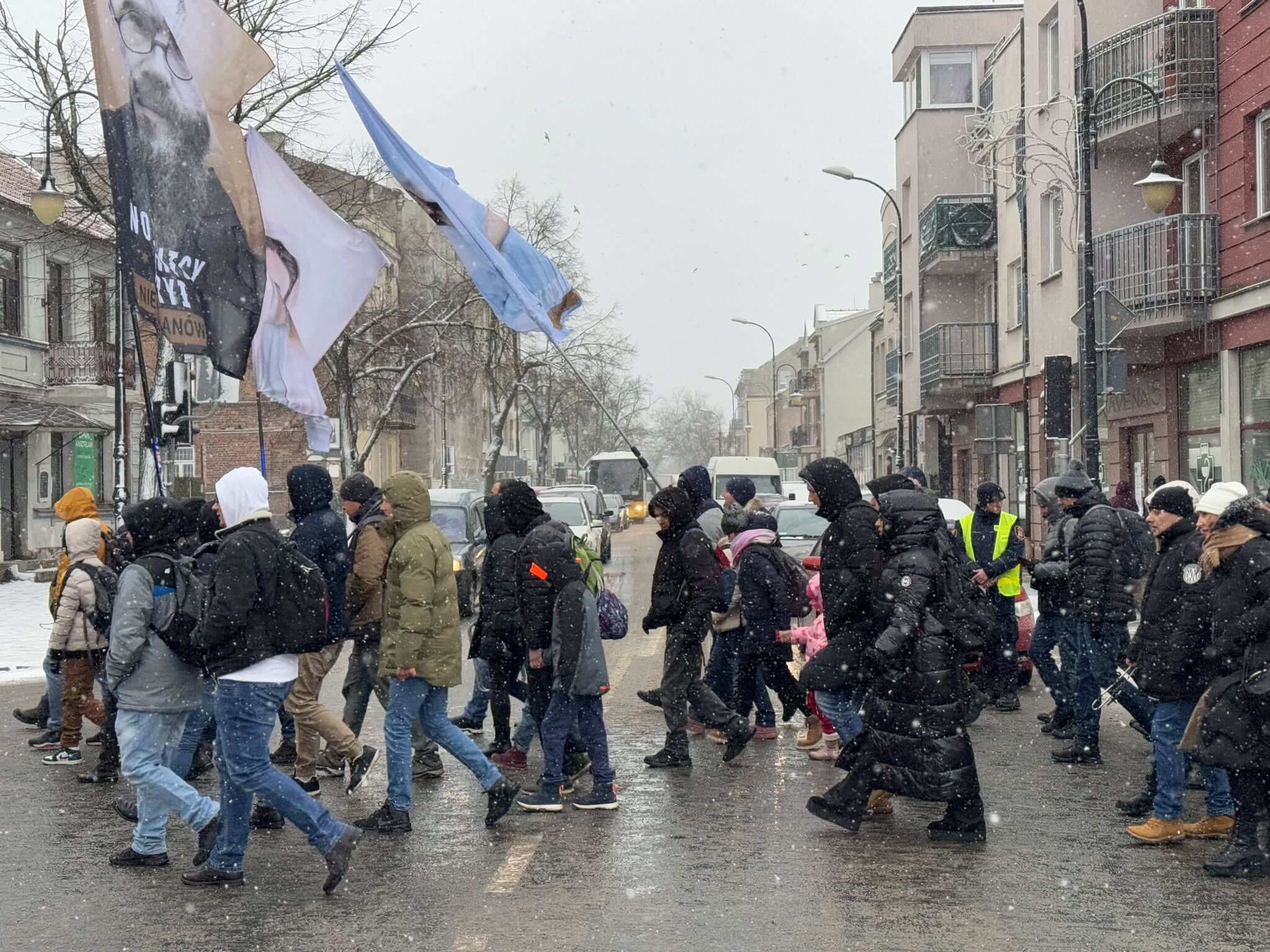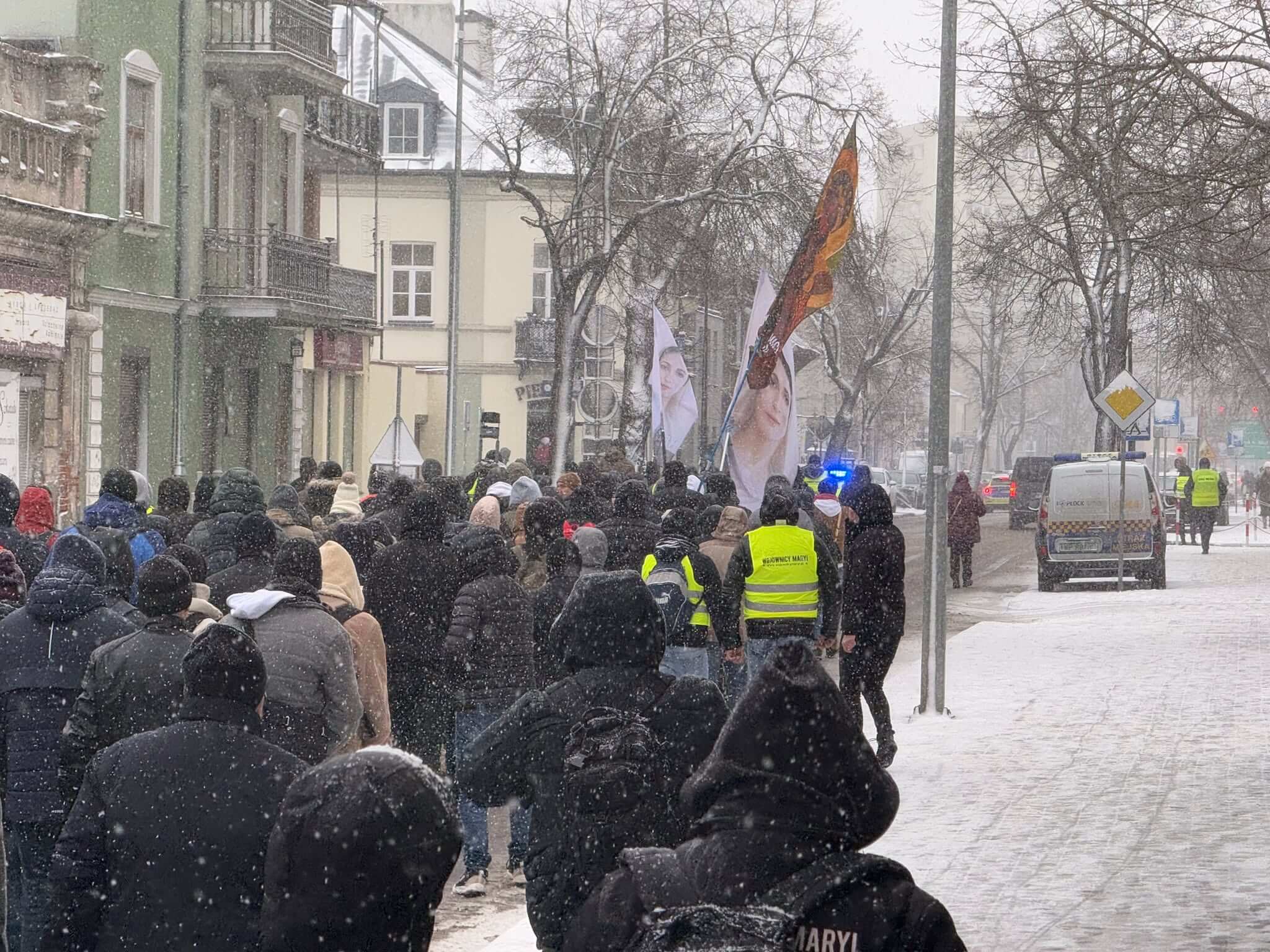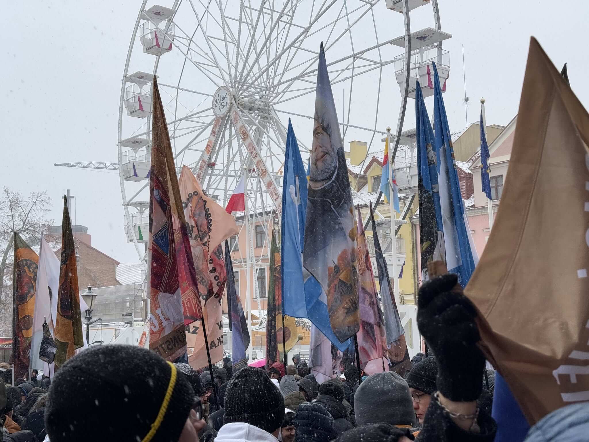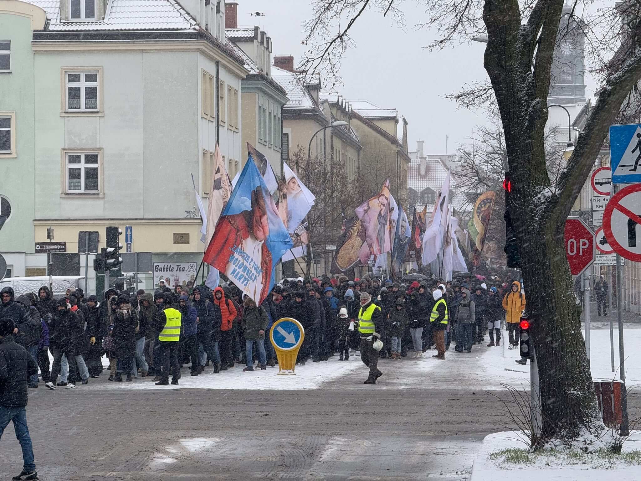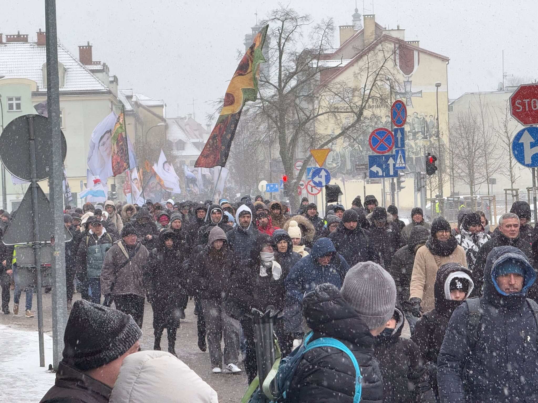 Wojownicy Maryi w Płocku. Z wielkimi flagami i różańcem w dłoniach przeszli ze Starego Rynku do Orlen Areny [FOTO, WIDEO]