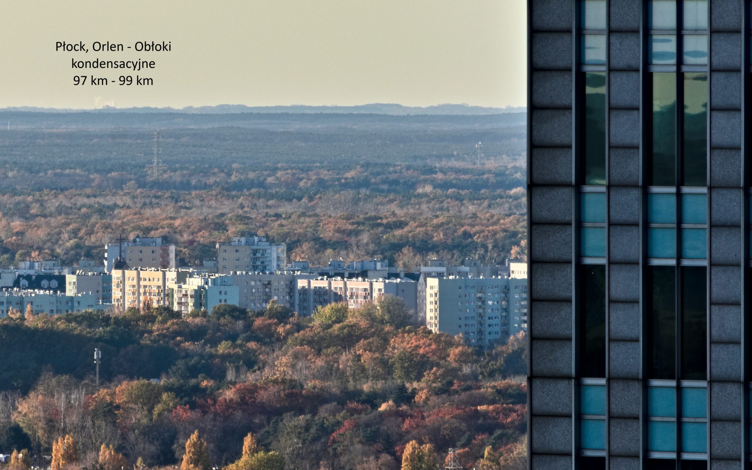 Okazało się, że jeśli się ma odpowiedni sprzęt foto, to kominy płockiego kombinatu widać nie tylko z tarasu Varso Tower (230 m, ogólnodostępny ma być dopiero za kilka miesięcy), ale również z ulokowanego 120 m niżej punktu widokowego Pałacu Kultury i Nauki. – Przy dobrej widzialności można dostrzec z niego obłoki kondensacyjne z płockich kominów – relacjonuje Tomasz Zawisza.