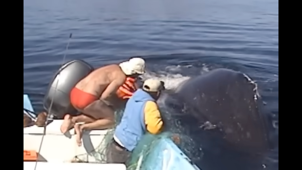 Wczasowicze pływający jachtem w wodach Zatoki Kalifornijskiej zaobserwowali ogromnego długopłetwca, wieloryba, który początkowo wyglądał na martwego lub konającego. Jeden z nurków wskoczył do wody, aby podpłynąć do niego i ocenić sytuację. Po chwili jednak stwierdził, że wieloryb jest zaplątany w wielką sieć rybacką i nie może się poruszać. Uwolnienie go wymagało wiele pracy całej załogi. Po kilku godzinach starań, cięcia lin i zsuwania kawałków sieci w końcu udało się pociąć sieć i uwolnić wieloryba. Wówczas uratowany olbrzym zaczął pływać wokół łodzi, wykonywać spektakularne skoki, i machać ogonem, jakby w podzięce ludziom za uratowanie. To wydarzenie również zostało sfilmowane. Kilka poniższych zdjęć ukazuje kolejne sekwencje całej akcji.
