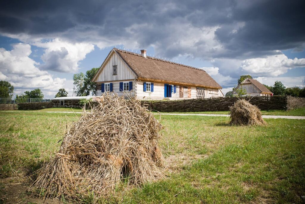 Detal wiązania ścian w narożniku oraz okapu jednej z zagród przeniesionych do skansenu. Architektura drewniana wysokiej jakości budowlanej. Wnętrza zaskakują przestronnością, ilością światła i pomysłowością kultury wiejskiego życia.