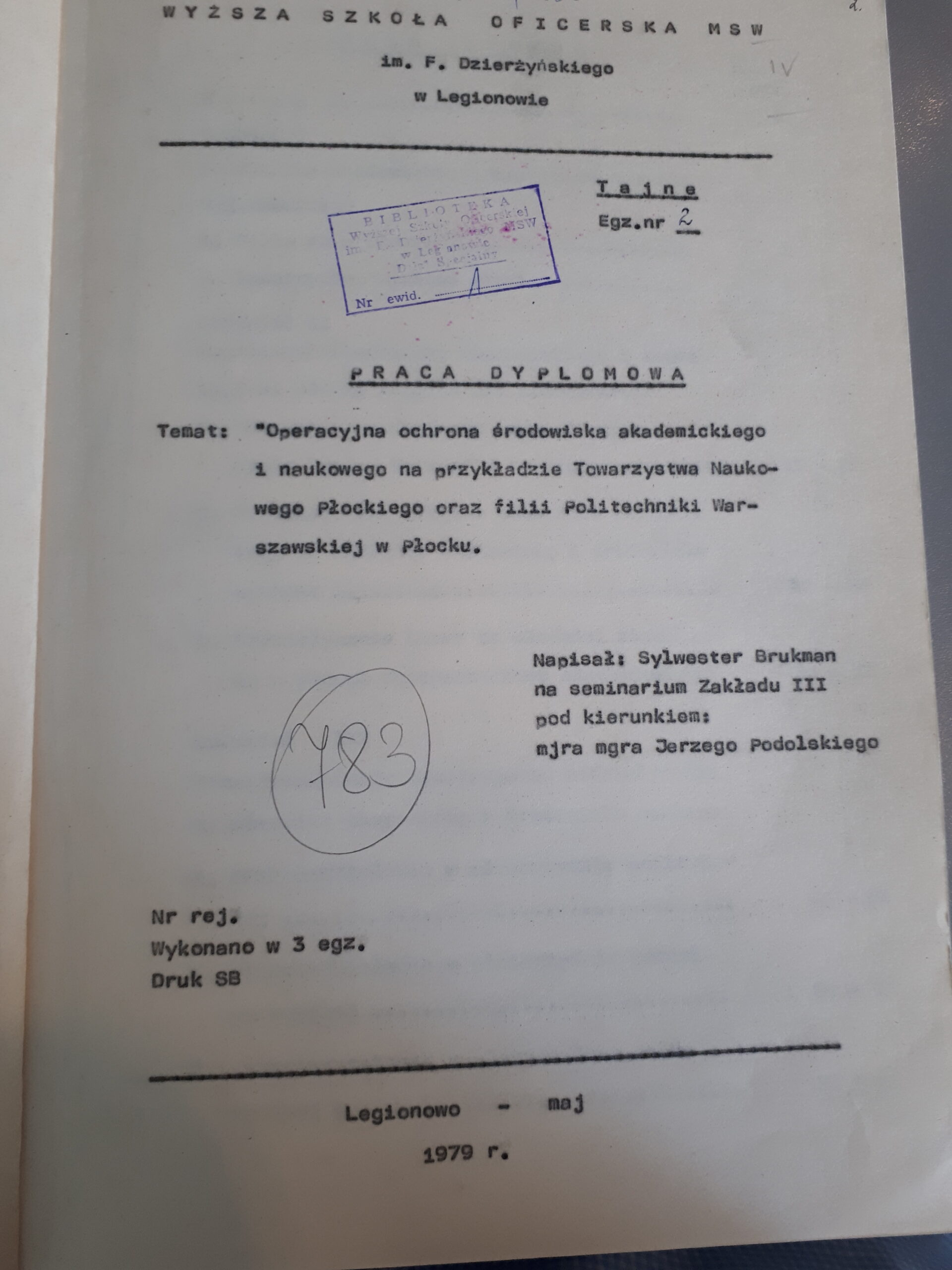 Na przykład funkcjonariusz SB Sylwester Brukman, po czterech latach pracy w płockiej Komendzie Wojewódzkiej w 1979 roku popełnił we wspomnianej „uczelni” z Legionowa dzieło atrakcyjne w formie (krótkie: 79 stron maszynopisu), ale nudne i mało konkretne pt. „Operacyjna ochrona środowiska akademickiego i naukowego na przykładzie Towarzystwa Naukowego Płockiego oraz filii Politechniki Warszawskiej w Płocku”. Nad ową pracą dyplomową czuwał major magister Jerzy Podolski, zasłużony oficer pracujący w Departamencie III peerelowskiego Ministerstwa Spraw Wewnętrznych.