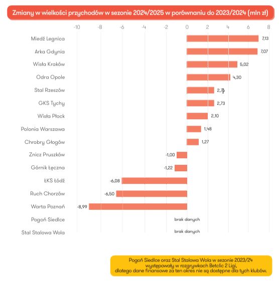Tę samą lokatę płocczanie zajmują pod względem wzrostu przychodów w porównaniu z wcześniejszym sezonem (plus 2,1 mln zł). W ogóle na plusie jest dziewięć klubów, przewodzi im Miedź Legnica. „Spadki przychodów dotknęły pięć klubów, w tym głównie spadkowiczów z Ekstraklasy – Wartę Poznań (- 8,99 mln zł), Ruch Chorzów (- 6,5 mln zł) i ŁKS Łódź (- 6,08 mln zł). Dane te wyraźnie pokazują, jak istotny wpływ na poziom generowanych przychodów ma dla klubów szczebel rozgrywkowy, na którym występują”.