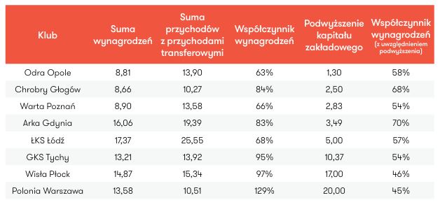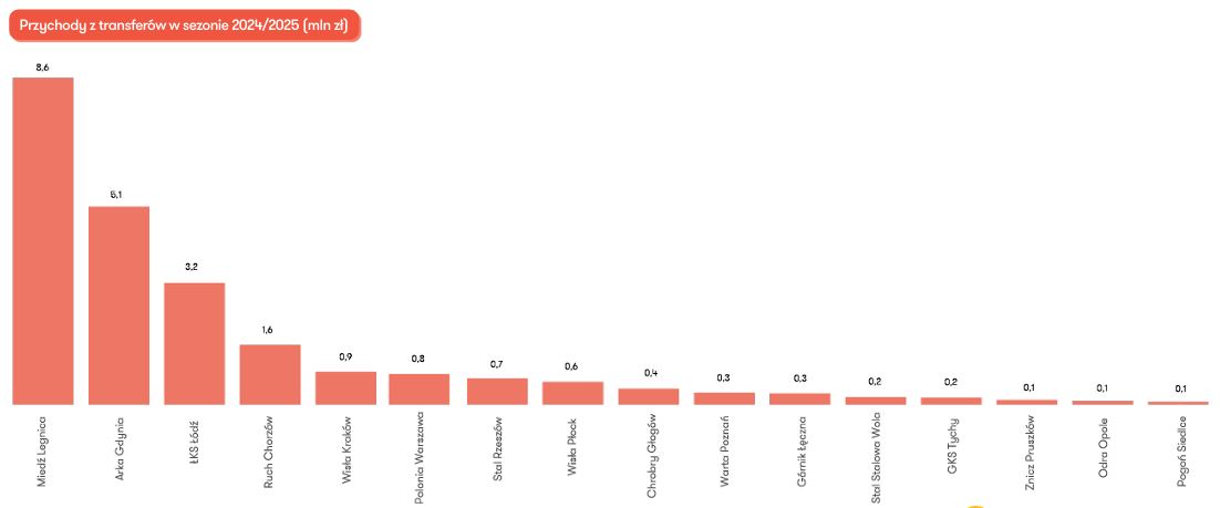 Skąd tak wysoka pozycja Miedzi? To rezultat rekordowego transferu Wiktora Bogacza do New York Red Bulls za ponad 8,3 mln zł. Na swoich zawodnikach znacząco zarobiła też Arka Gdynia. Wisła Płock wykazała 600 tys. zł. Udział transferów w budżetach klubów rośnie. „Relacja przychodów z transferów do przychodów ogółem w poszczególnych klubach w większości przypadków nie przekracza 5 proc., jednak w dwóch przypadkach przebity został próg 20 proc.”.