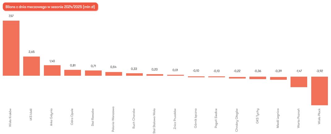 Największą stratę na dniu meczowym osiągnęła Wisła Płock, generując 3,92 mln zł straty.
