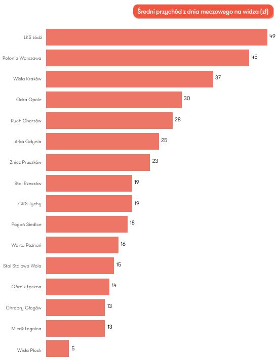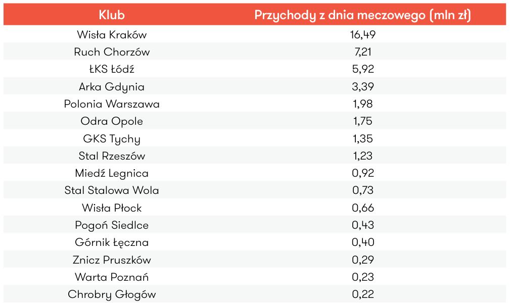 „Przeprowadzona analiza obejmuje przychody z dnia meczowego oraz koszty organizacji meczu, rozumianego jako wydarzenie sportowe. W ramach kosztów nie zostały ujęte pozycje związane z doprowadzeniem drużyny na mecz (zgrupowania przedmeczowe, odnowa biologiczna, koszt strojów itp.), a jedynie organizacja wydarzenia (m.in. zużycie energii i innych mediów, zapewnienie bezpieczeństwa w postaci ochrony, punktów medycznych i informacyjnych, najem stadionu, obsługa cateringowa). Bezkonkurencyjnym liderem rankingu jest Wisła Kraków, która na dniu meczowym zarobiła ponad 7,6 mln zł. Kolejne miejsca podium uzupełniły ŁKS Łódź oraz Arka Gdynia, która wywalczyła awans do PKO BP Ekstraklasy, zarabiając odpowiednio 2,65 mln zł oraz 1,4 mln zł. Kluby te cechuje duża baza oddanych kibiców, a w przypadku Białej Gwiazdy poza bardzo dobrą frekwencją na dobry wynik wpływ miały również występy w kwalifikacjach do europejskich pucharów”.