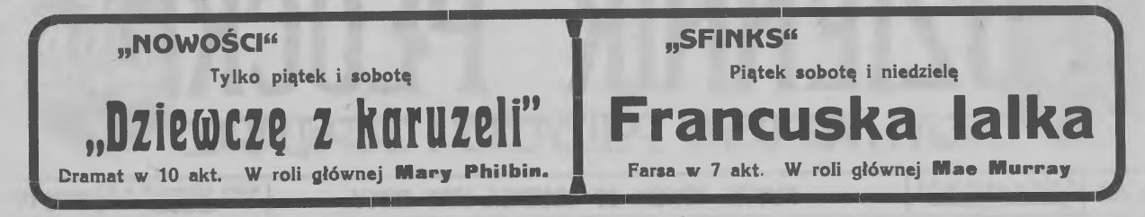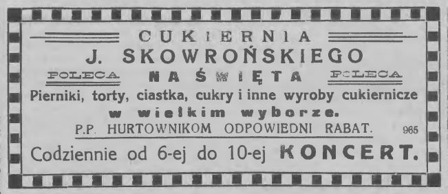 „Stowarzyszenie Robotników Chrześć. zawiadamia, że wzorem lat ubiegłych urządza w drugim dniu świąt Bożego Narodzenia opłatek, połączony z choinką dla dzieci. W tym też celu w nadchodzącą niedzielę o godz. 5 ej po południu w lokalu Stów. przy ul. Misjonarskiej dokonany zostanie zapis dziatwy, chcącej wziąć udział w choince. Zapisu mogą dokonać rodzice, lub opiekunowie w niedzielę do godz. 8 wieczorem.