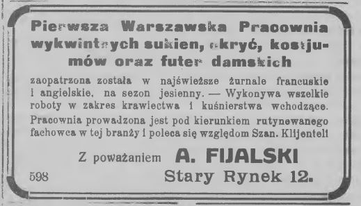 „Mamy całe setki pań płockich różnego stanu, różnej zamożności, które jednakowoż same nie są zdolne przygotować dla siebie odpowiedniego ubrania. Jako polki powinny rozumieć, że w dzisiejszej dobie, — polce należy wyszukiwać polskich pracowni damskich. Takie ujęcie rzeczy stanowi o naszym dobrze zrozumianym patriotyzmie. Przez ręce naszych kobiet w ciągu roku przechodzą tysiące złotych; nie zostawiajmyż ich w rękach niepolskich. Kupujmy tylko wyroby krajowe”.