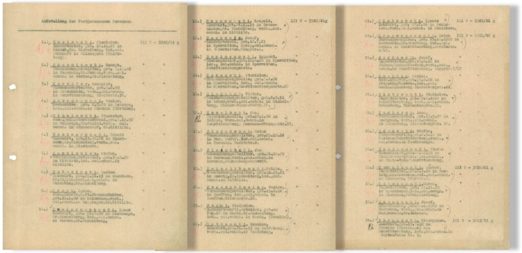 Wszystkim zatrzymanym […] udowodniono, że brali udział zarówno w tworzeniu, jak również rozprowadzaniu nielegalnych polskich pism. Podczas gdy funkcjonariusze […] »POZ« takie pisma tworzyli pod własnym zarządem, to w przypadku »ZWZ« zostały one przeważnie sprowadzone nielegalnie z Generalnego Gubernatorstwa i według określonego planu rozdzielone pomiędzy członkami, jak również polskiej ludności […]. Jak już na początku wspomniano, wprowadzenie kwarantanny z powodu tyfusu przyczyniło się do znacznej zwłoki w zakończenie dochodzeń i przesłuchań. Tym samym proszę, by do ich zakończenia złożyć wnioski o zastosowanie aresztu ochronnego w Głównym Urzędzie Bezpieczeństwa Rzeszy”6.